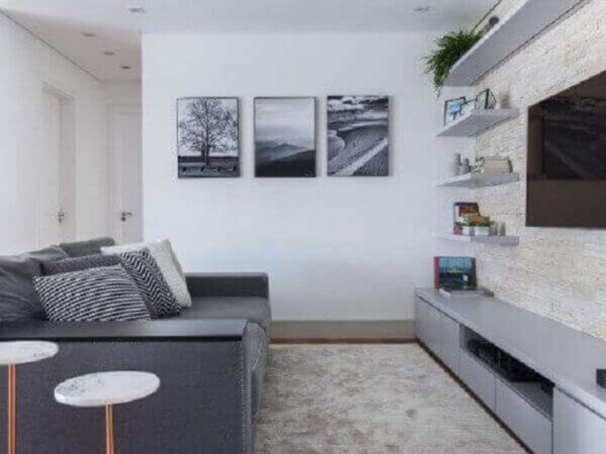 Cores perfeitas para salas pequenas: Como já falamos anteriormente, mas é importante ressaltar, a combinação de cinza e branco para sala pequena é perfeito para ajudar na sensação de amplitude do ambiente, principalmente se você optar por tons de cinza claro;
