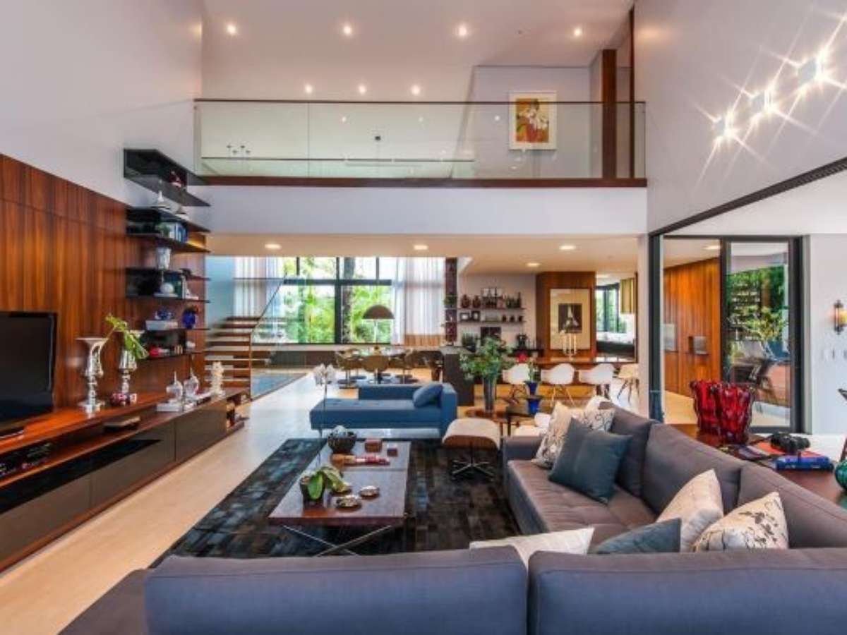 84. Sala grande decorada com tapete e móveis confortaveis e pé direito alto – Projeto c2haarquitetos