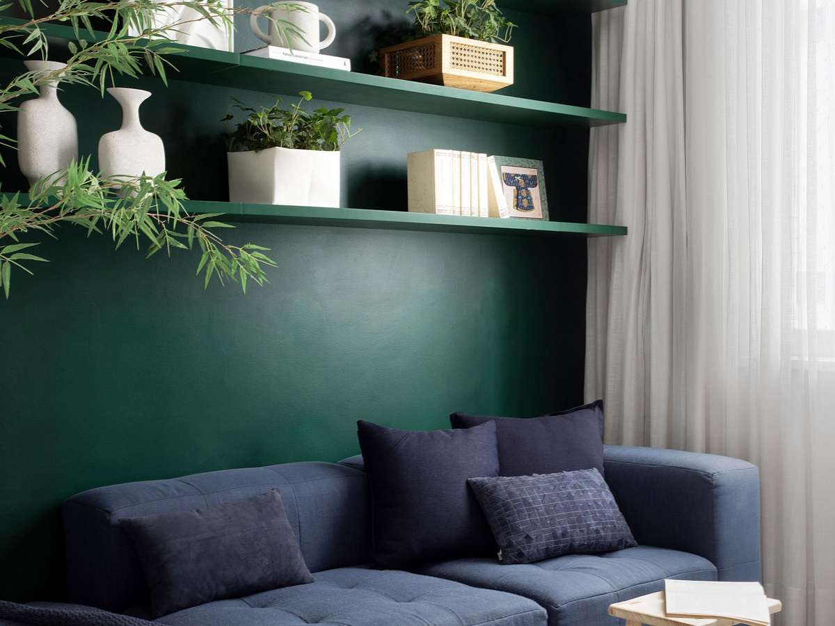 Neste projeto de Travessa Arquitetura as cores sóbrias são um ponto de destaque. Enquanto a cozinha ganhou uma marcenaria cinza, a sala íntima, que foi criada a partir de redivisão de dois quartos, recebeu um painel verde e um sofá azul.