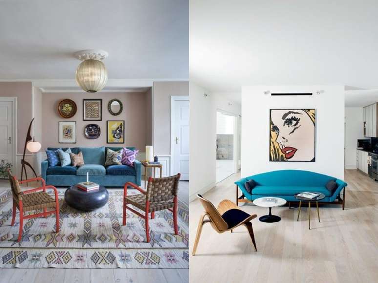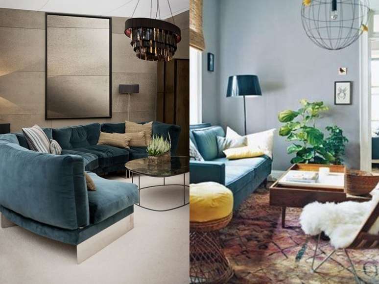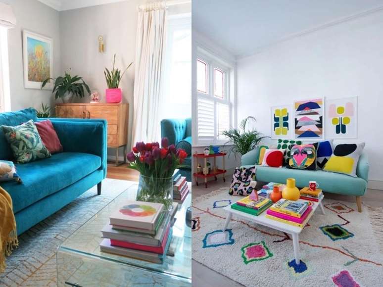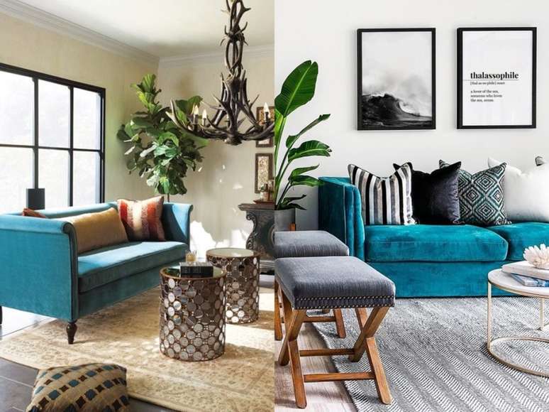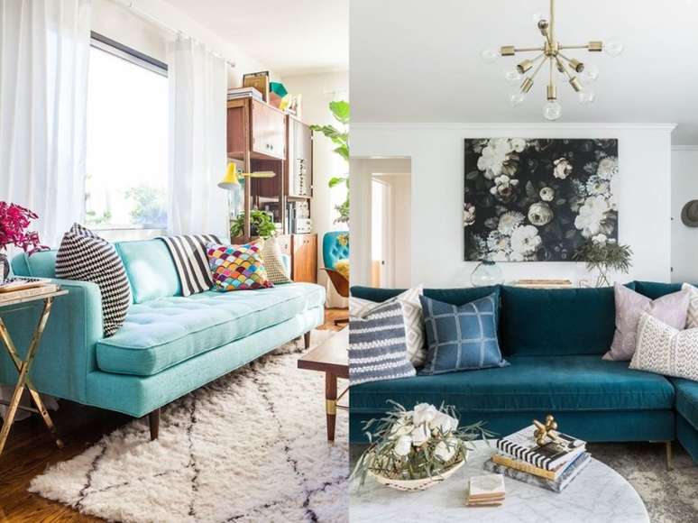 Um sofá turquesa pode ser integrado a um espaço neutro ou escuro, será um sotaque de cor super ousado que animará toda a sala. Outra ideia é e quilibrar com outros tons ousados, o que é legal para um interior boho ou maximalista.