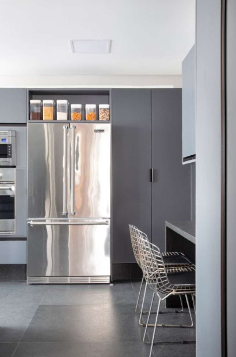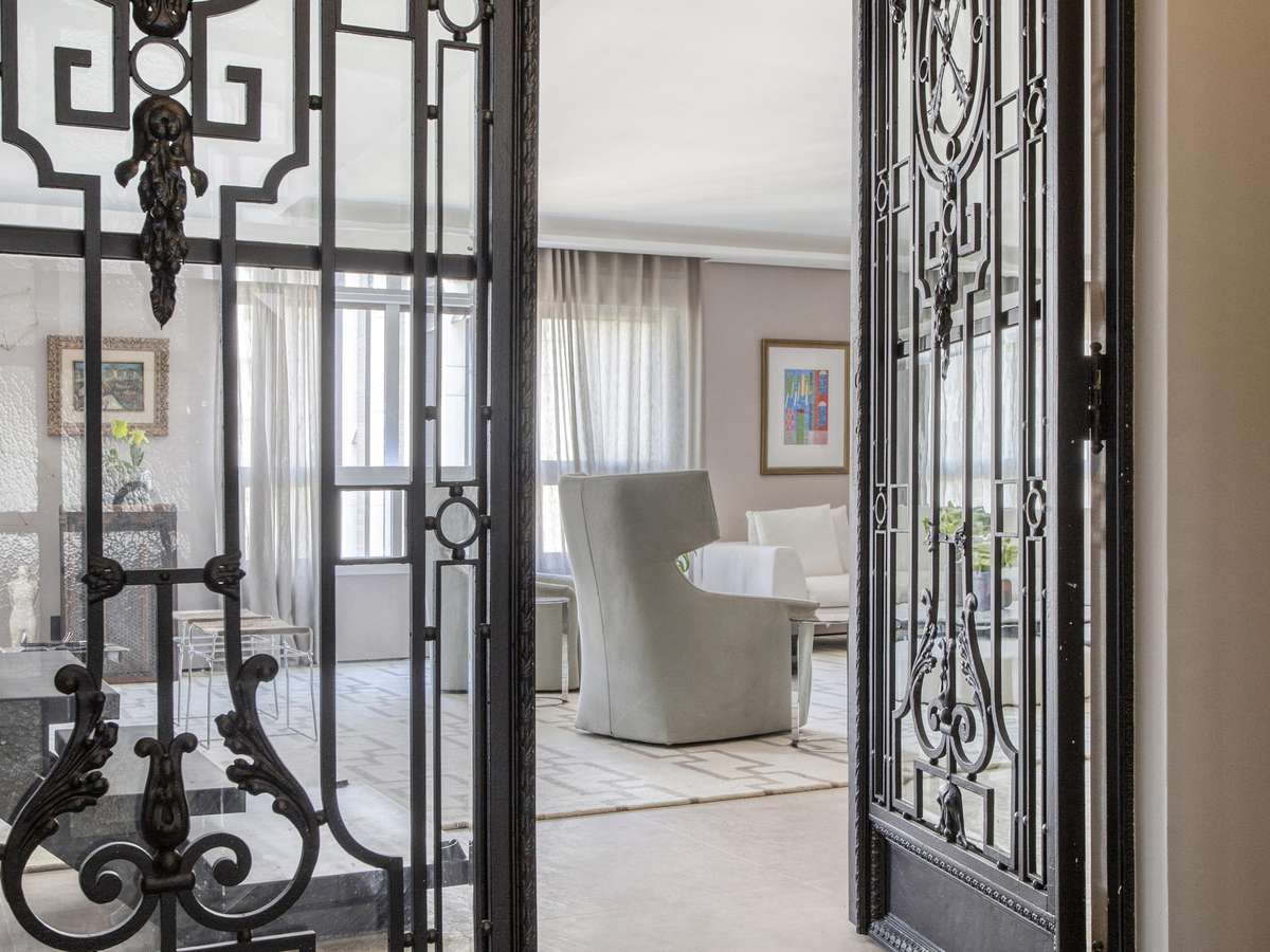 Originais do apartamento, a porta em ferro forjado e o piso em tabuleiro de dama preto e branco foram mantidos e restaurados, pois tinham tudo a ver com a elegância que o novo projeto buscava. "A história da porta é bem interessante. O prédio foi construído por um Barão do Café, que morava nesta cobertura, e seus filhos moravam nos apartamentos abaixo. Por isso, sua estrutura em ferro forjado tem desenhos de folhas e frutos de café, além do brasão da família", conta David.
