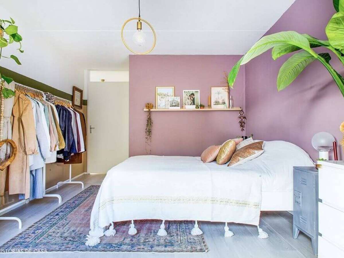 1. Decoração clean com tapete para quarto com vasos de flores e arara de roupas – Foto: Pinterest