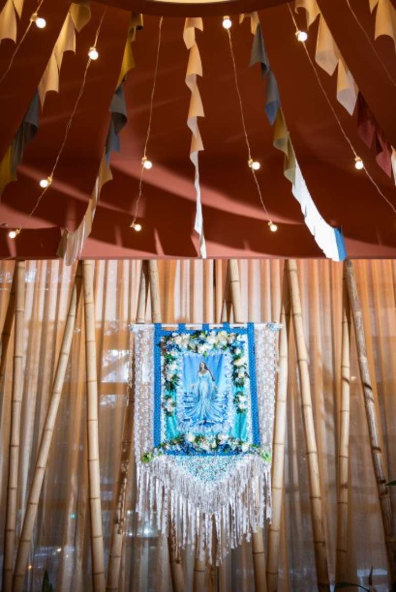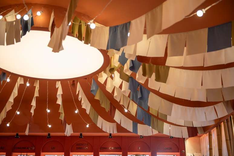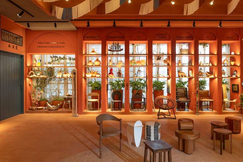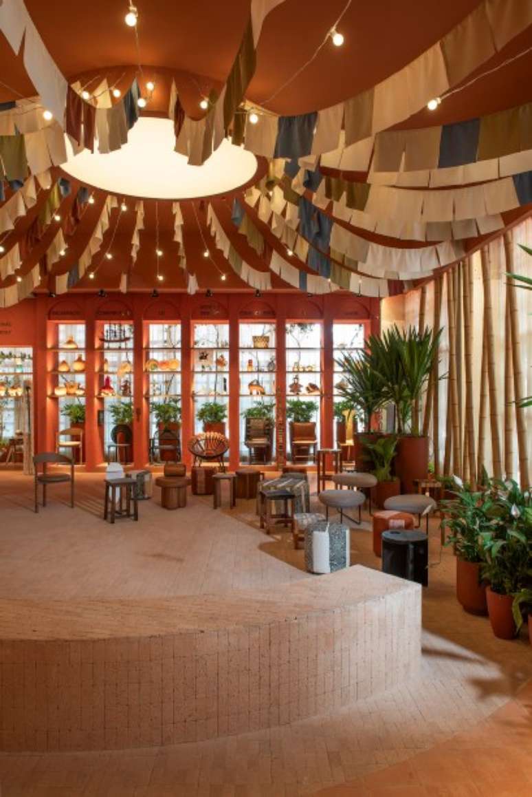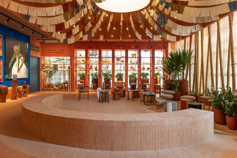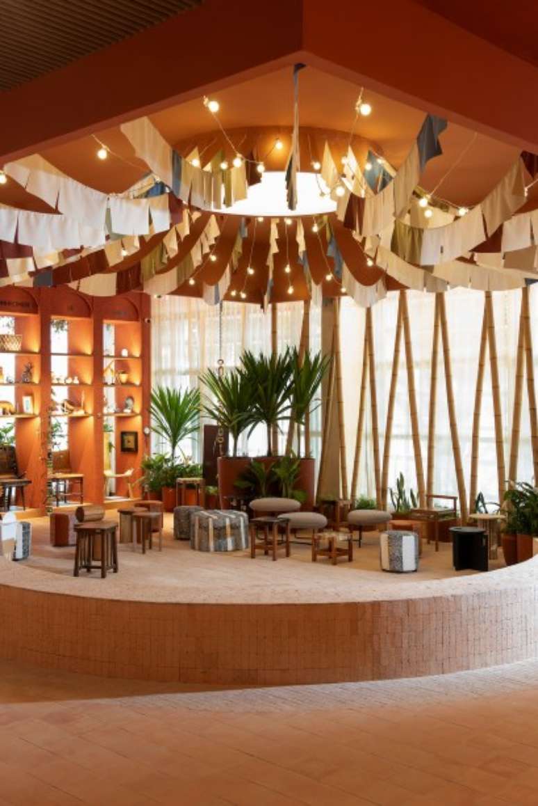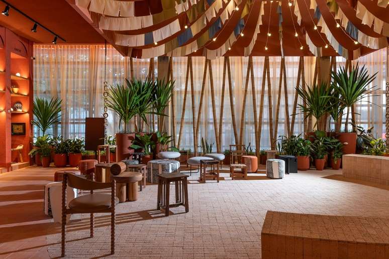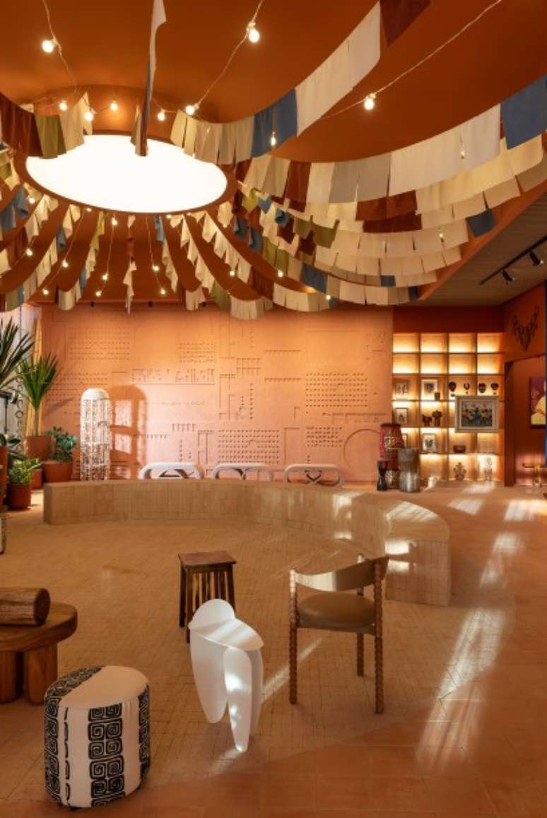 Logo após, há os sete dias da semana representados por orixás, por meio do design, sem imagens explícitas, mas com pequenas instalações que evocam esse tipo de referência. E na sequência, ainda temos o espaço central que é protagonista do Terreiro. O ambiente se desdobra em um grande círculo e será usado como apoio para rodas de conversas e entre outros eventos sob a chancela oficial da CASACOR.