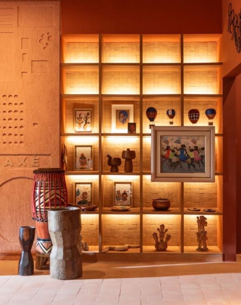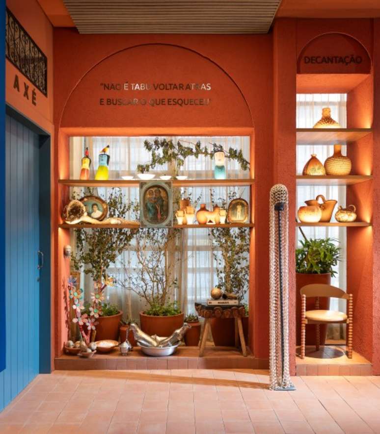 O espaço tem 141 m² e o protagonismo do matiz terracota se apropria do pisar no chão, da terra batida, do estar em casa. " Usar lajotas e revestimentos que criam essa ligação com a terra e com o barro faz todo sentido", reflete. Na entrada, as boas-vindas ao recinto, se dão por meio de altares que recebem os visitantes fazendo referência à família e à ancestralidade, um amálgama preciso à narrativa deste ano da edição CASACOR São Paulo: "De presente, o agora".