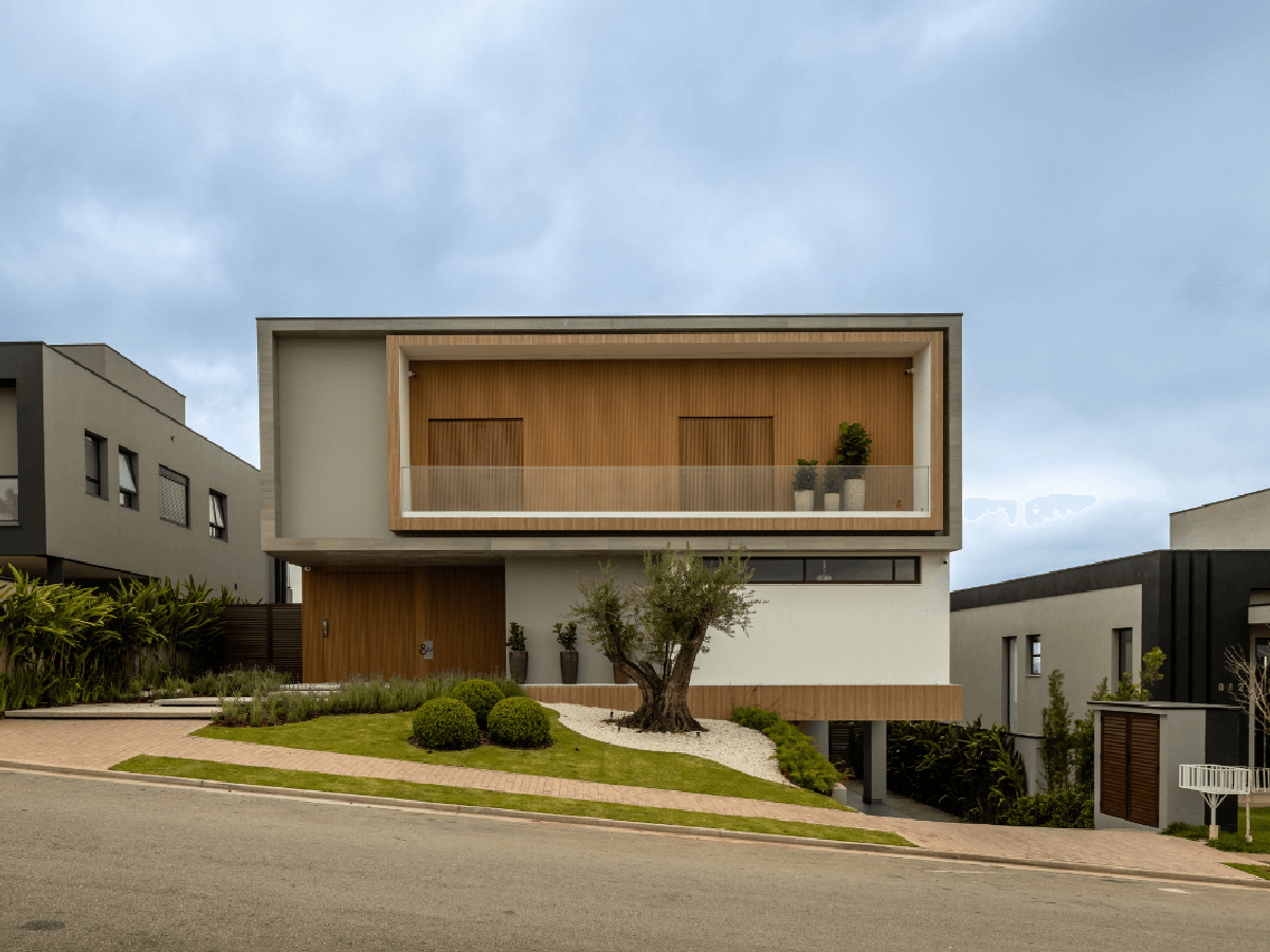 Essa solução é especialmente vantajosa em terrenos em declive, onde o desnível permite acomodar os veículos abaixo do nível da rua de forma natural. Em terrenos em aclive, a garagem tende a ficar alinhada ou ligeiramente acima da via, reforçando a verticalidade da construção, sobretudo quando o condomínio autoriza um pavimento adicional.