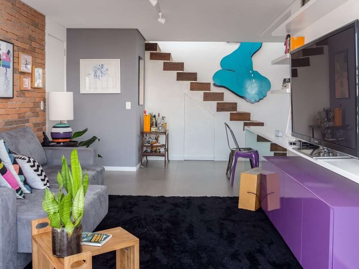 No piso inferior do apartamento duplex, que ocupa cerca de 80 m² dos 120 m² totais, encontramos a sala de estar. O ambiente conta com sofá cinza retrátil, parede de tijolinho aparente, tapete escuro e móveis em tons de roxo e branco.