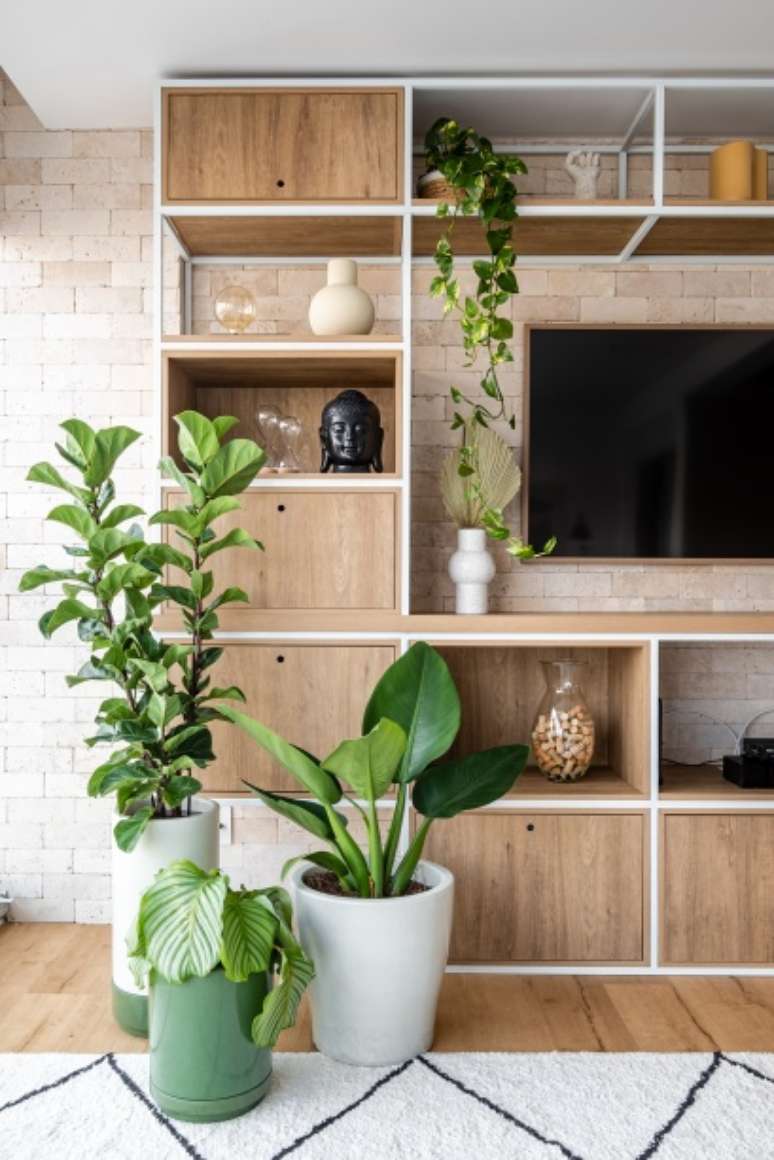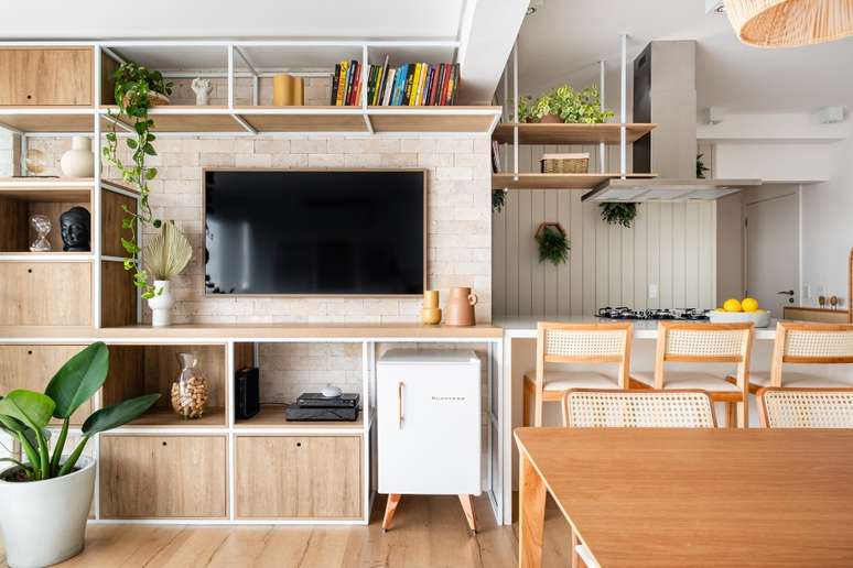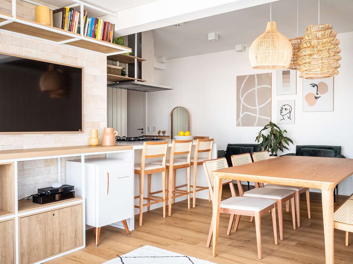 Tijolinhos, madeira, plantas e palha criam aconchego neste apê de 80 m²