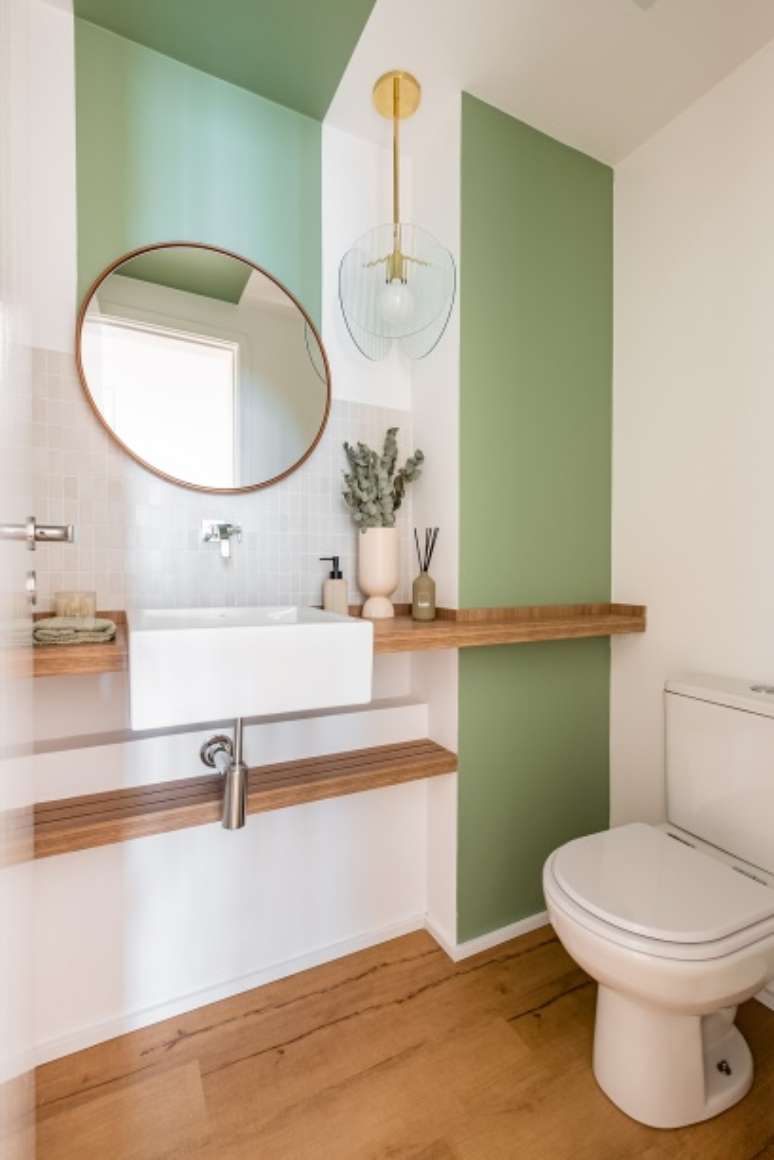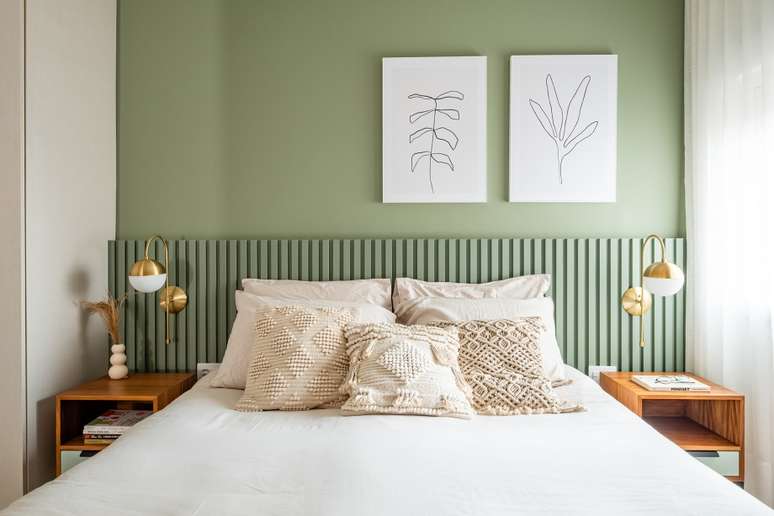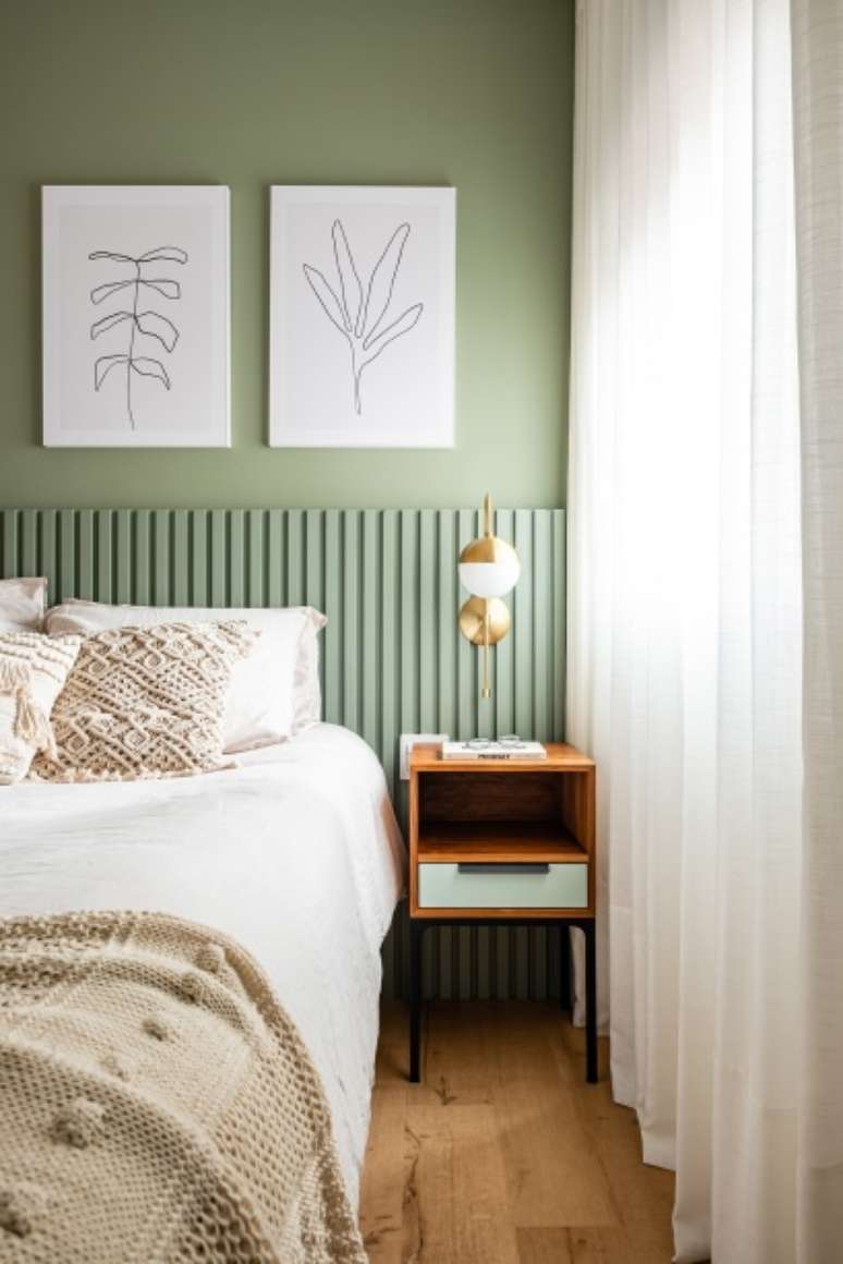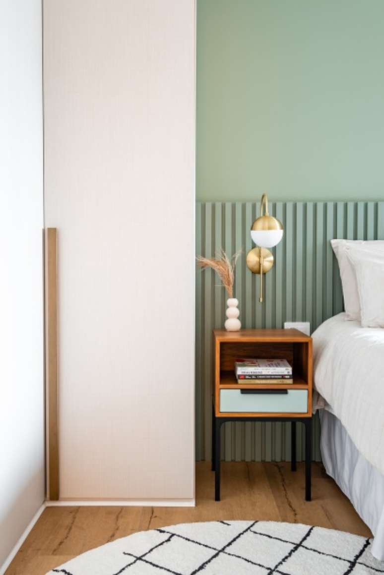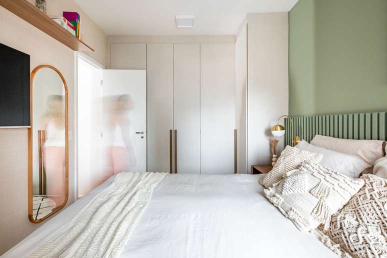 Já na suíte máster, a arquiteta escolheu o verde para trazer destaque ao cômodo. A iluminação anterior também foi substituída por lâmpadas quentes e trouxe novos pontos de LED na marcenaria.