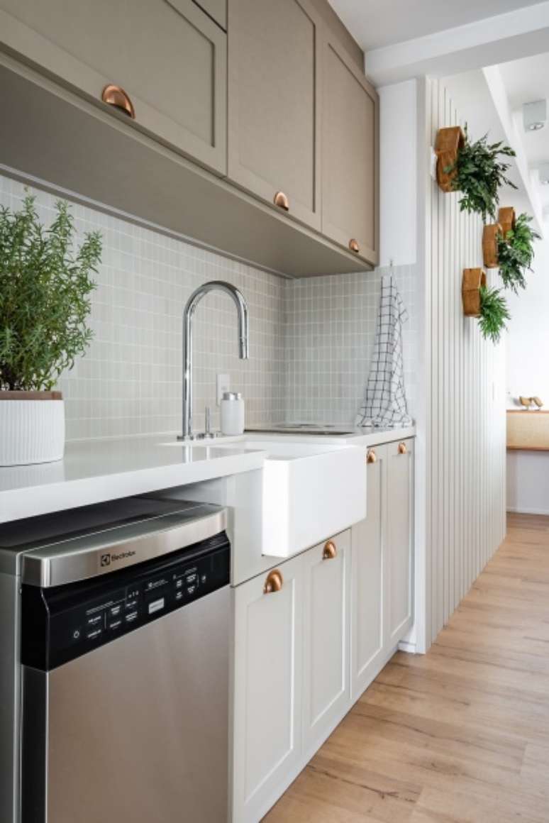 As bancadas da cozinha e lavanderia foram feitas de quartzo branco. O piso escolhido para todo o apartamento foi o vinílico. "Também colocamos um revestimento de pedra no formato tijolinho para dar destaque à parede da TV", conta.