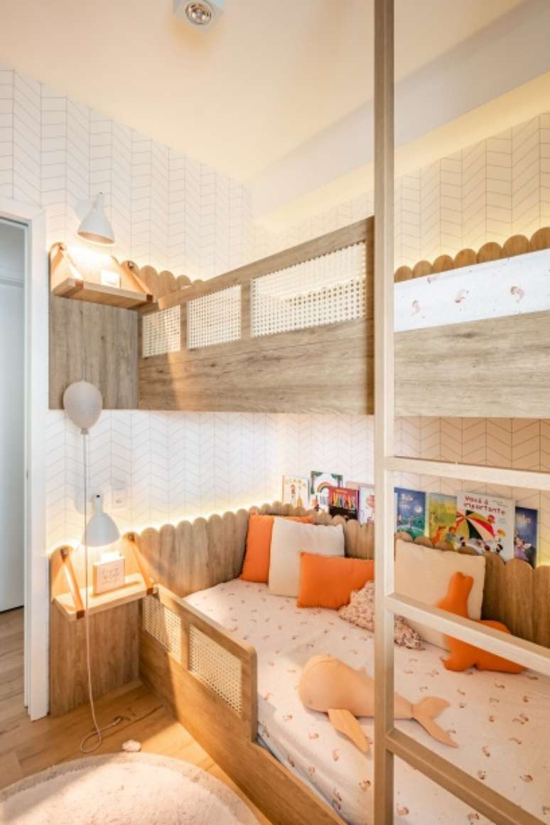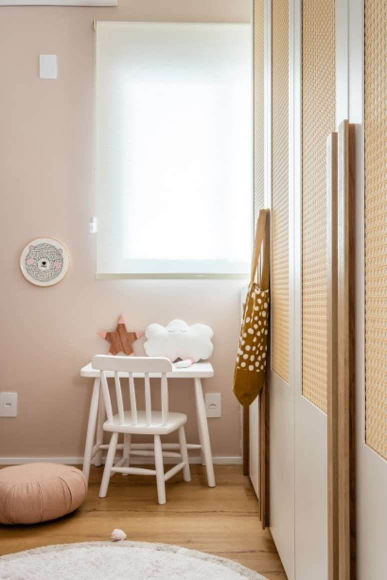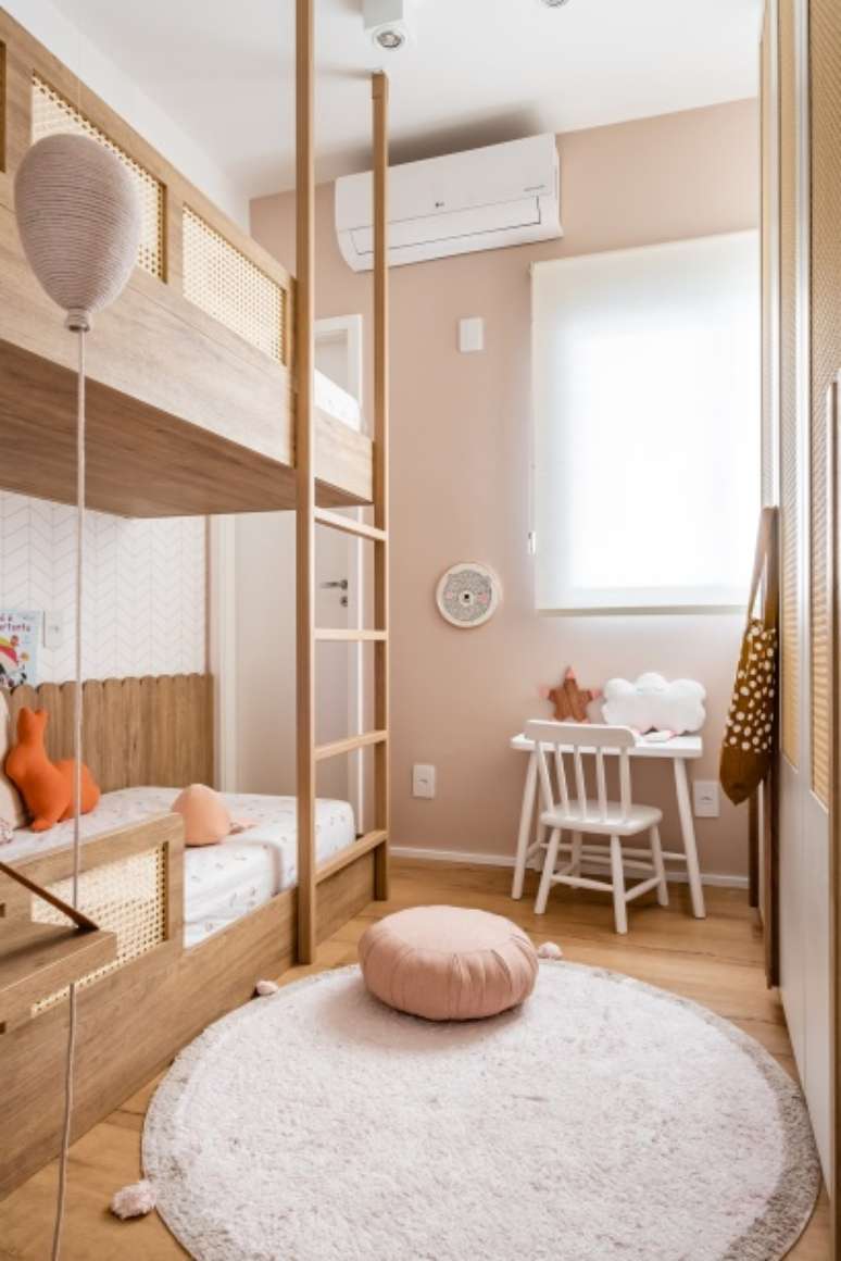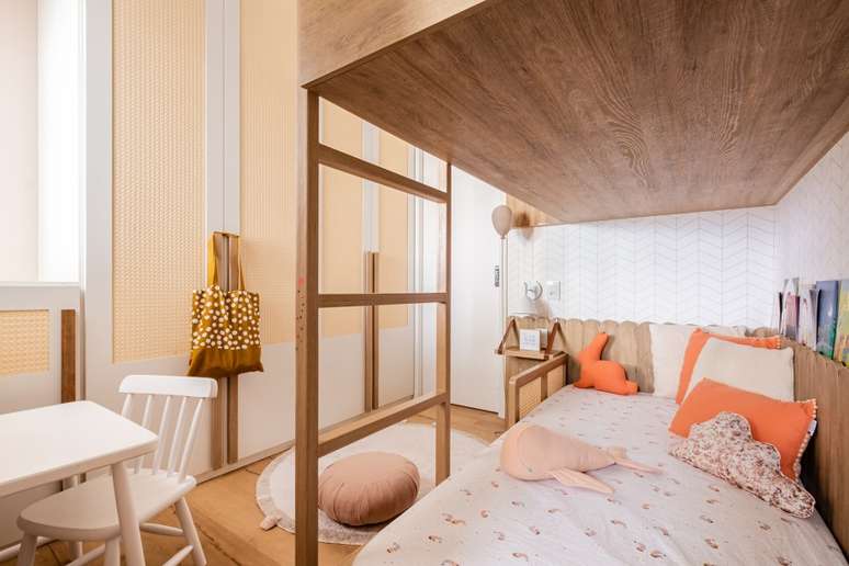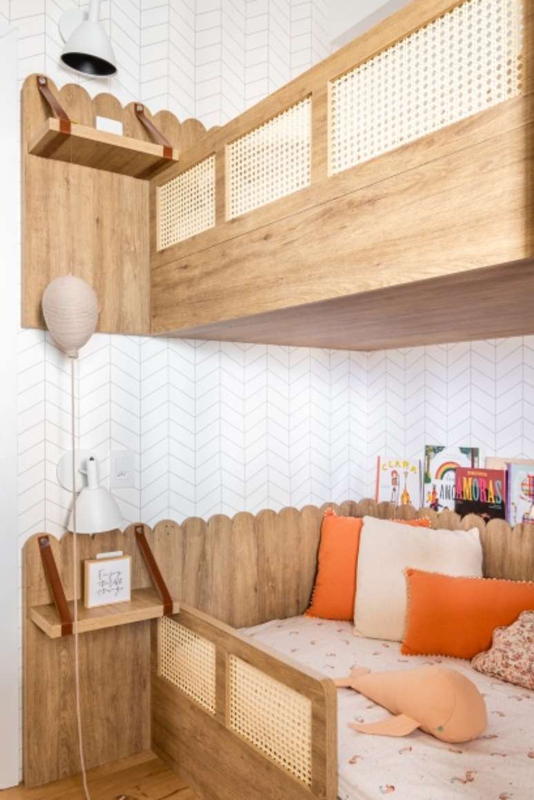 Na suíte da filha, o primeiro pedido dos clientes foi uma cama beliche. "Pensamos em prateleiras nos dois andares da cama para armazenar de maneira funcional os livrinhos infantis. Também trouxemos palha e tons de madeira clara, para o cômodo ", explica Mariana.
