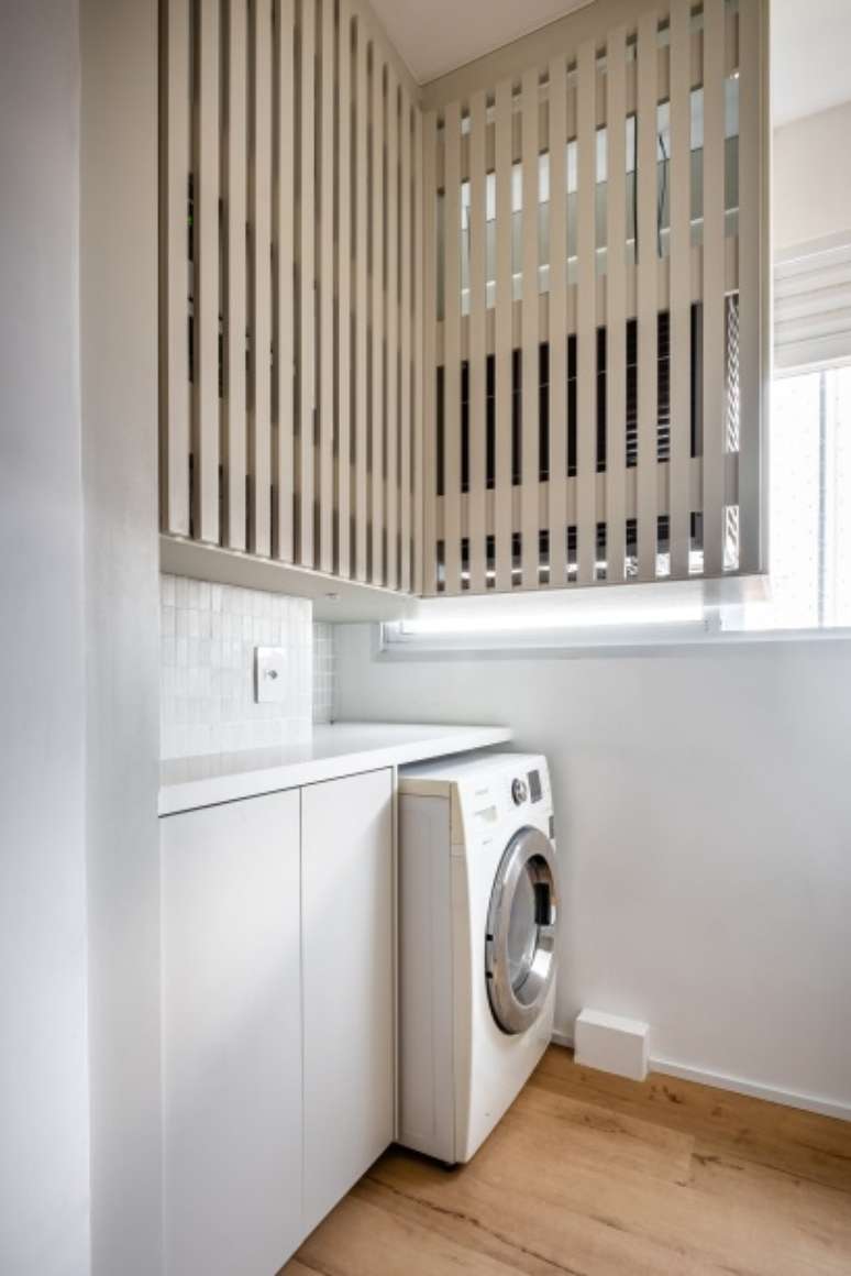 A porta de vidro que separava o living do terraço foi retirada e a sala também foi integrada à cozinha, aumentando a sensação de amplitude. "Criamos um grande living integrado, que abriga cozinha, sala de TV, sala de jantar e terraço. A lavanderia está anexada à cozinha e pode se integrar ou não", diz a profissional.