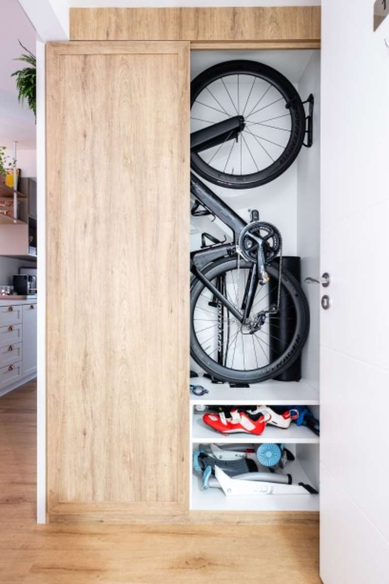 No hall de entrada, um armário abriga um mini depósito esportivo, criado para armazenar os equipamentos de triátlon do cliente.
