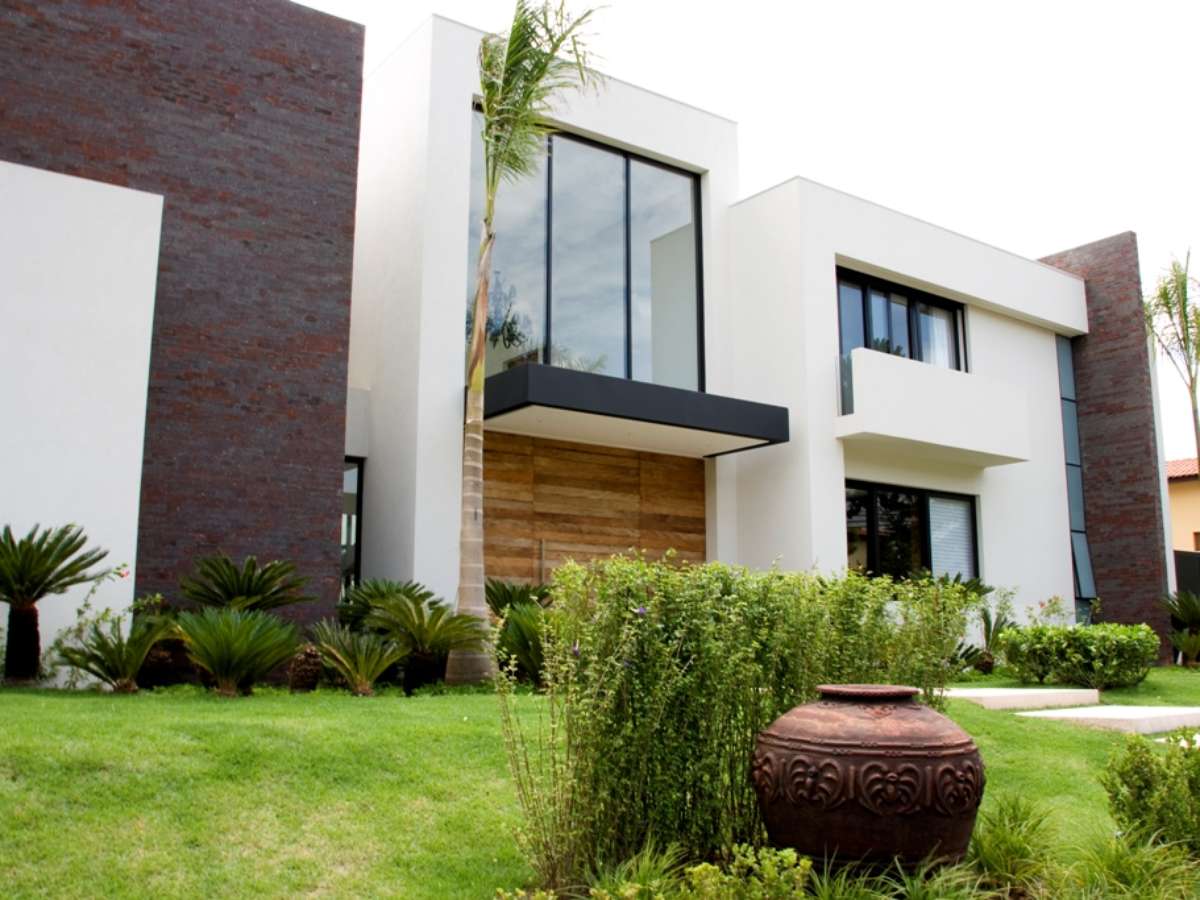 No detalhe da casa em Alphaville, é possível ver a combinação de diferentes materiais, como metal, vidro e tijolos