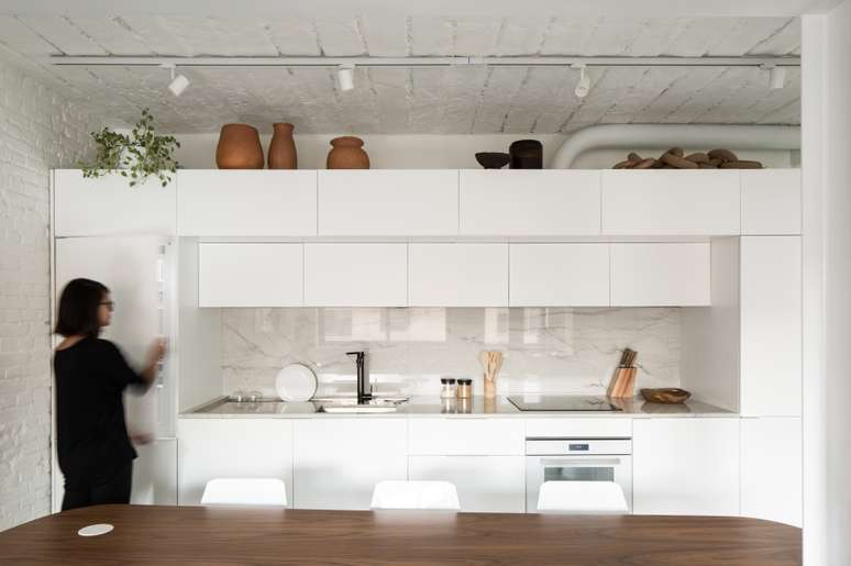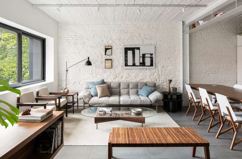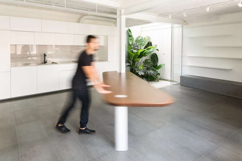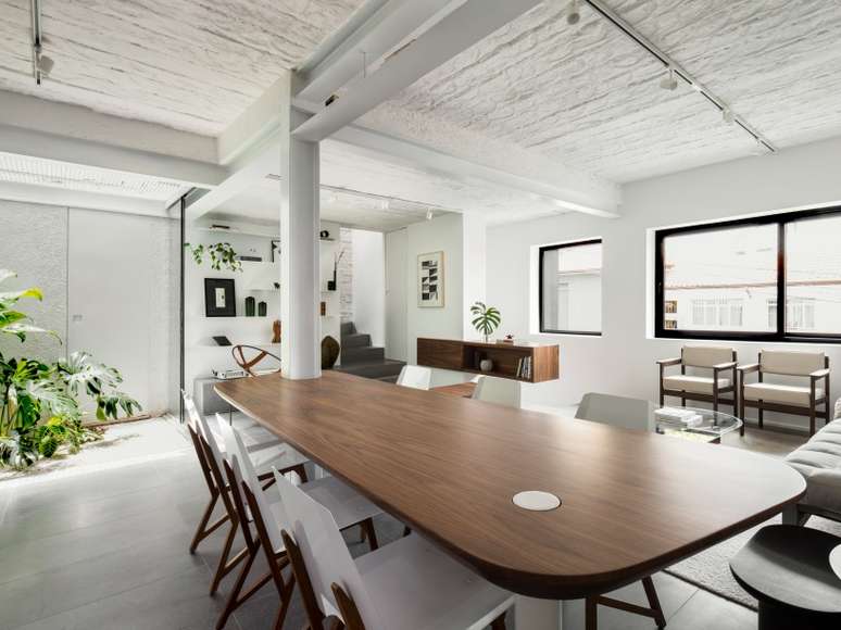 A decoração mistura peças criadas pela nova geração de designers brasileiros junto de objetos de valor emocional, vindos de antiquários ou heranças de família. O destaque é a mesa de jantar, que foi desenhada exclusivamente para o projeto. Ela gira no eixo do pilar metálico central, permitindo diferentes configurações.