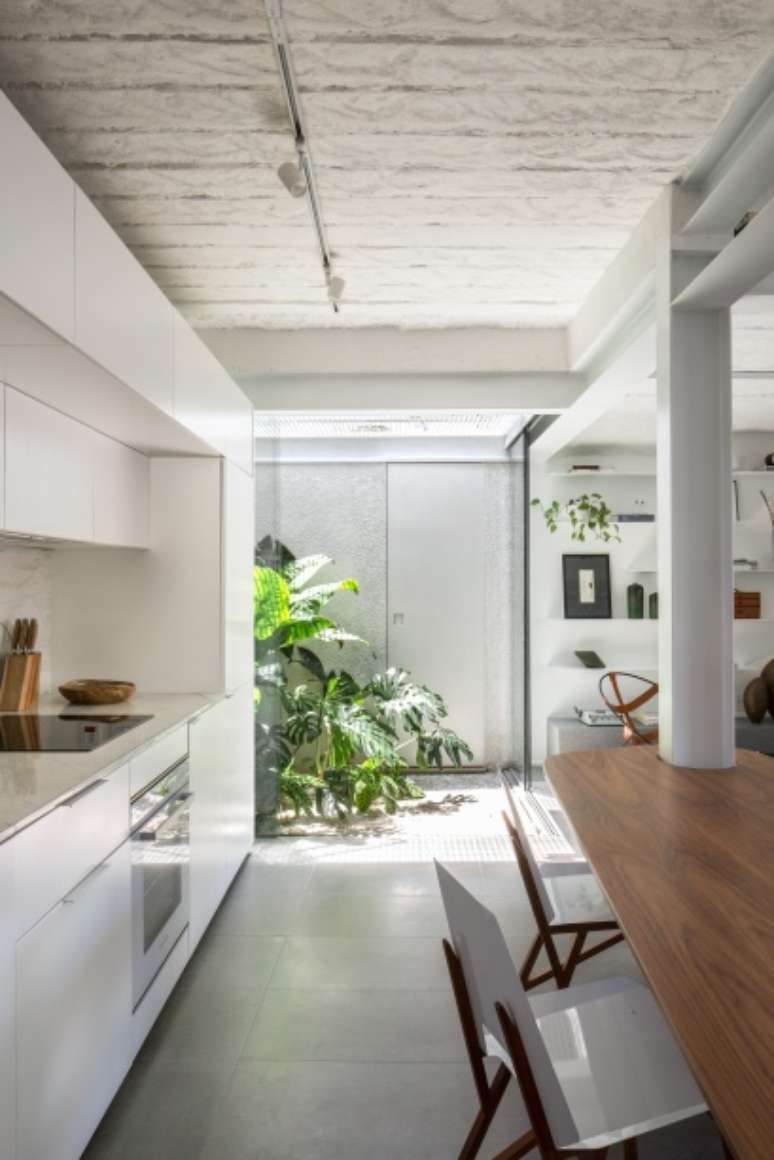 Para aproveitar terreno e maximizar o conforto nos interiores, as paredes internas do pavimento social e um trecho de laje não original foram removidos, criando um único espaço multifuncional.