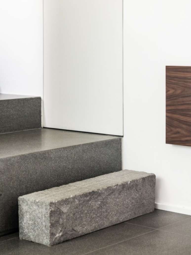 Os profissionais contam que "a preferência pelo emprego de materiais naturais, como: a pedra basalto e a madeira nogueira, para revestir os pisos dos ambientes, ou a pedra quartzito na bancada da cozinha, proporcionou a atmosfera de acolhimento e conforto desejado para os espaços da casa". O branco, presente na paleta de cores e marcenaria traz sensação de amplitude e claridade.