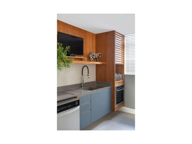 O rack de uma das salas com tv, por exemplo, ganhou acabamento em laca azul turquesa e a cor foi replicada em alguns detalhes da varanda gourmet anexa. Já na sala de baixo, o tom de azul adotado é mais sóbrio, por vezes acinzentado, para deixar o ambiente mais tranquilo e acolhedor.