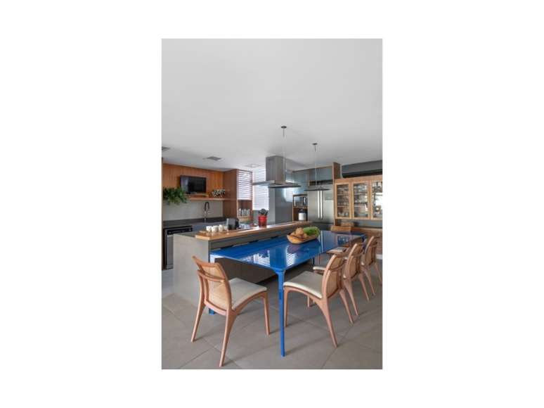No mesmo pavimento, a mesa de refeições azul bic rouba a cena na cozinha principal, que conta ainda com marcenaria ora cinza ora em freijó natural, para equilibrar.