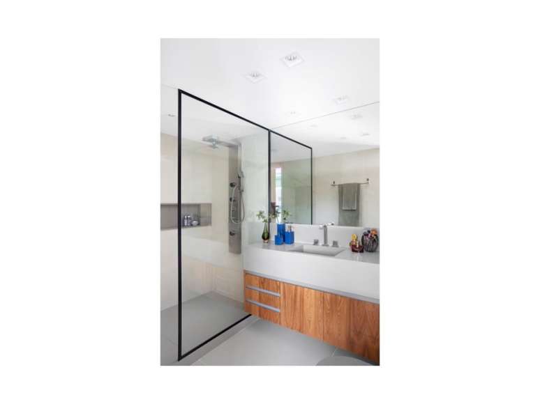 Para aumentar a sensação de amplitude e integração desses espaços e criar uma unidade visual entre eles, foi usado o mesmo piso de porcelanato num tom de cinza claro com acabamento fosco.