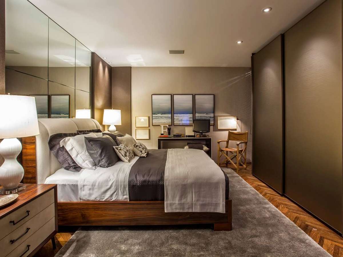 1. Quarto de casal em tons de marrom e parede espelhada – Foto Pinterest
