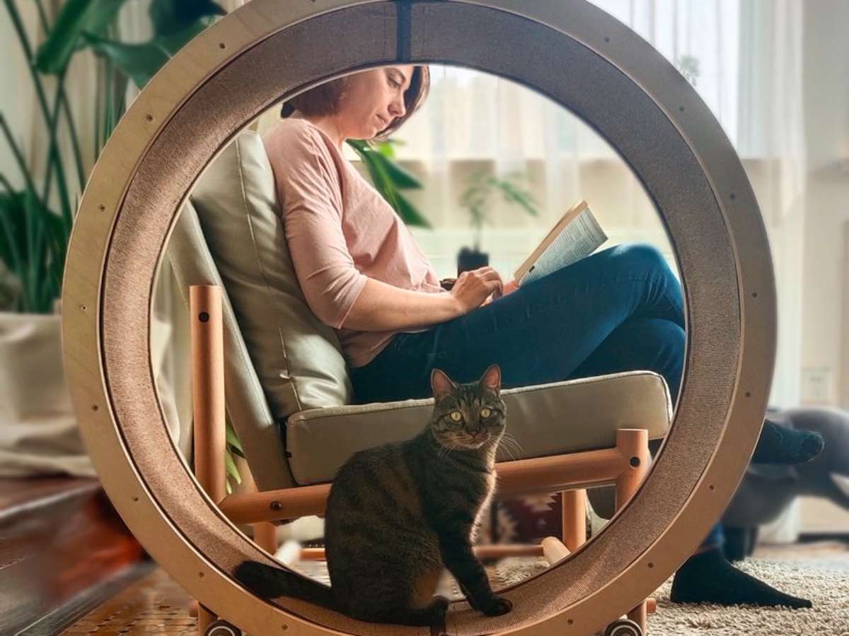 Assinada por Stephan Verkaik e Beth Horneman, a cadeira mescla dois mundos diferentes em um, dando aos proprietários a oportunidade de relaxar confortavelmente, enquanto o gato está brincando ativamente ao lado. Uma vez que os gatos sentem seu companheiro humano próximo e envolvido, eles são encorajados a usar a roda com mais frequência.