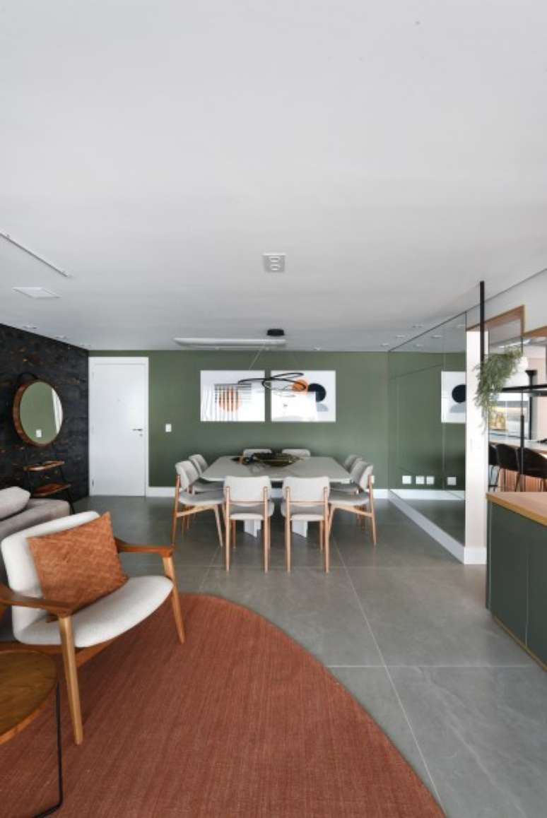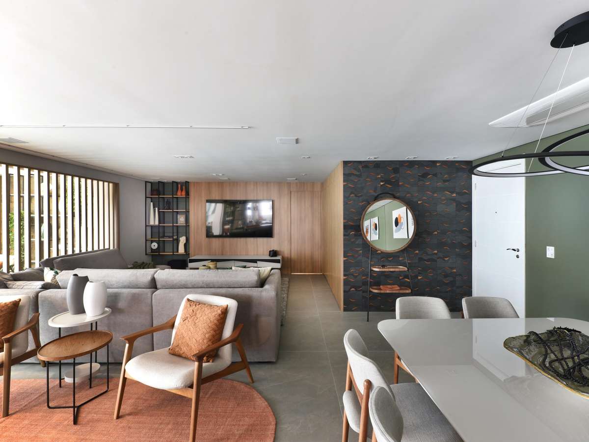 Dividida em três partes, a sala de estar se destaca pela combinação da madeira com elementos em tons terrosos e acabamentos em verde menta. Nas costas do sofá voltado para o lado da TV, as poltronas confortáveis convidam para um bate-papo ou degustação de bebidas. Ao fundo, a mesa de jantar, com tampo em laca, é espaçosa e perfeita para acomodar 8 pessoas.