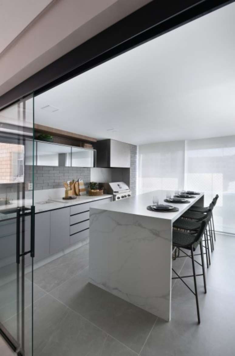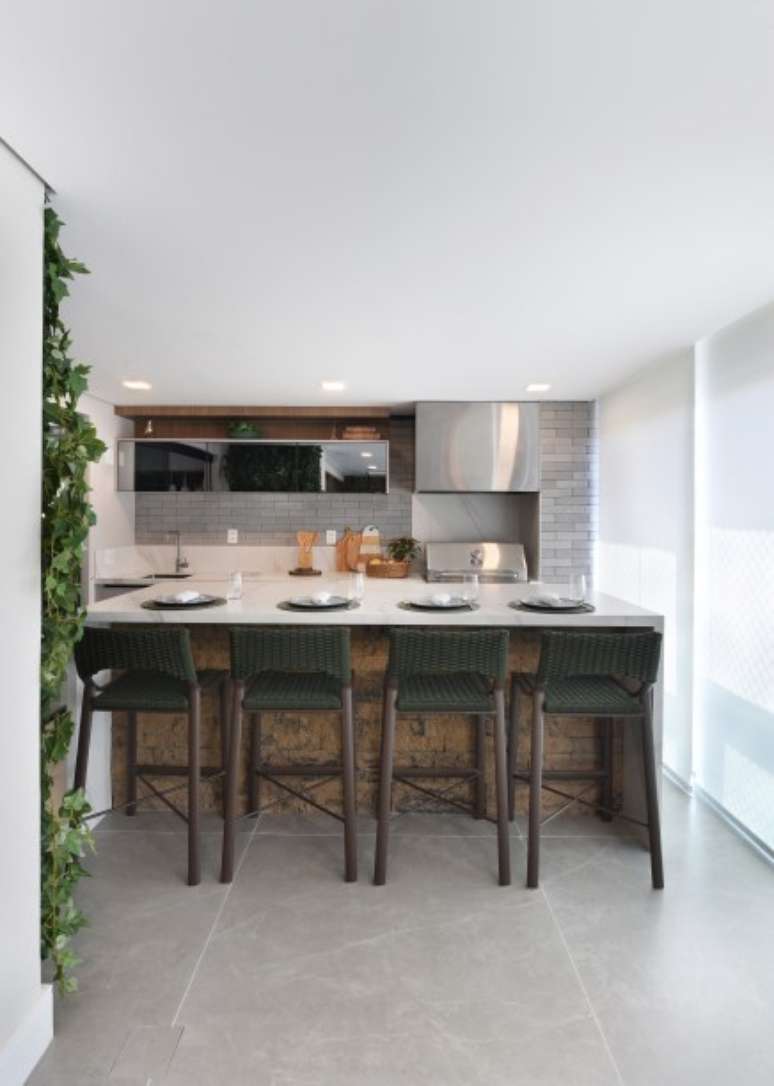 Com a bancada executada com lâmina ultra compacta, os moradores contam com a tranquilidade da resistência ao calor e durabilidade contra riscos e manchas. Integrada com a cozinha, os churrascos são garantidos com o equipamento a gás.