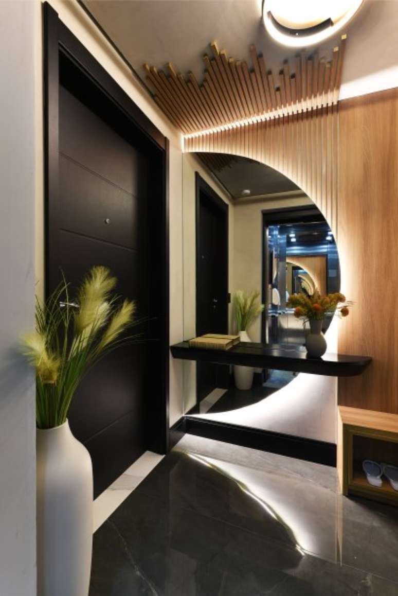 Unindo elegância e funcionalidade, logo na entrada a profissional instalou um espelho em formato de meia lua que propicia não apenas a reflexão visual, mas também a sensação de amplitude. Estrategicamente colocado, o banco é prático para calçar e descalçar sapatos.