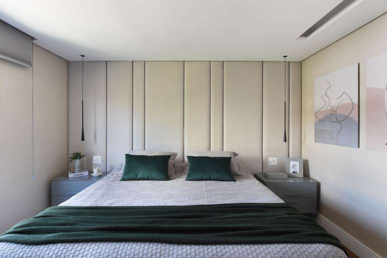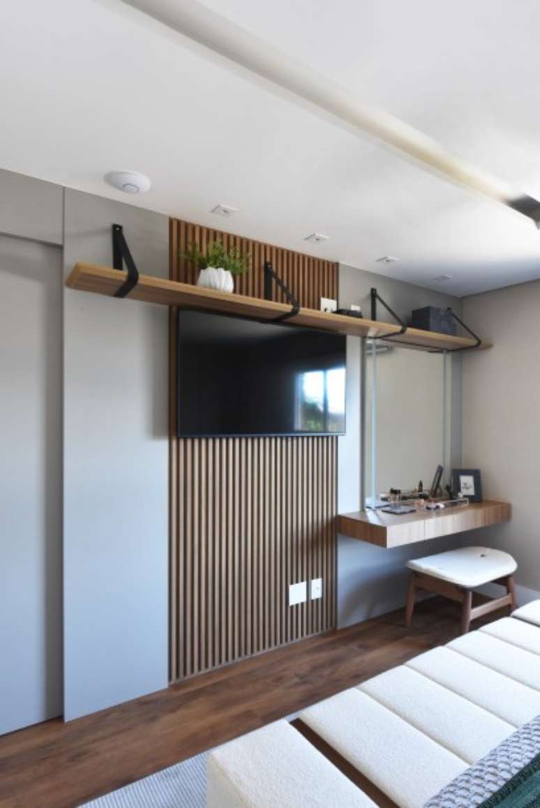 Como um refúgio sereno, o décor do dormitório do casal exala uma paleta sóbria e soluções como a porta de correr para o acesso dos moradores e que tem, na mesma sequência, o ripado que recebeu a TV e uma bancada suspensa para a penteadeira. "Outro detalhe interessante são as alças de couro que sustentam a prateleira acima da TV", detalha a arquiteta.