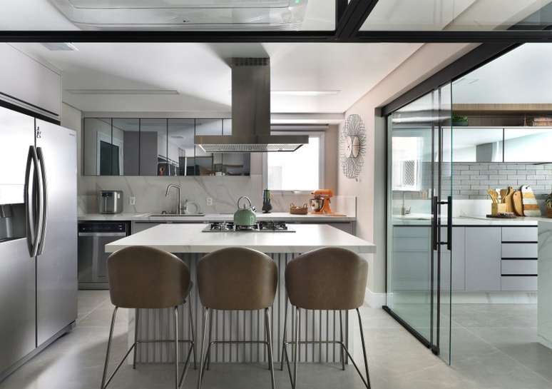 Moderna e muito bem planejada, a cozinha é arrojada, agradável e tem como destaque a ilha central, em lâmina ultra compacta, e equipada com cooktop e coifa.