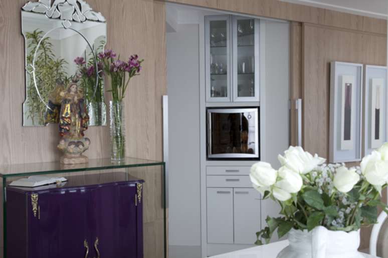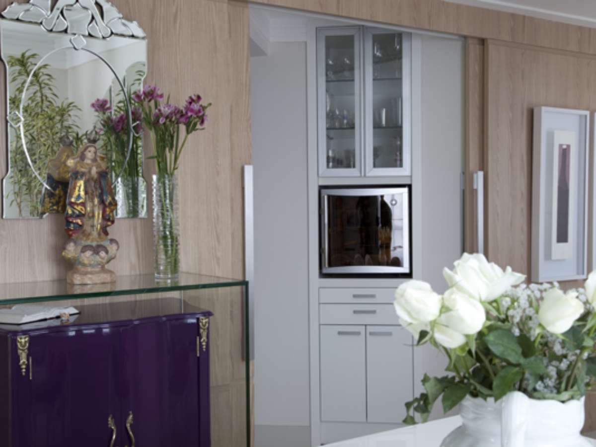 Embaixo do aparador de vidro, há espaço para um móvel. A proposta é assinada pelo arquiteto Marcos Contrera