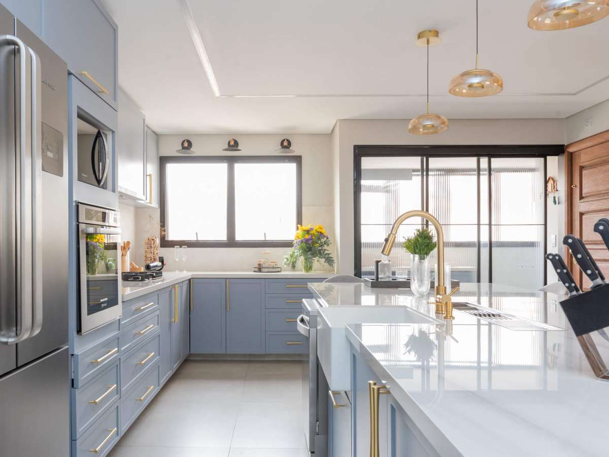O ponto de partida é definir a opção que irá compartimentar a cozinha e a área de serviço. Ela pode ser feita em serralheria e fechamento de vidro e madeira, por exemplo, considerando as portas em tipologias que melhor atendam o projeto, como as mimetizadas, de correr ou de folhas.