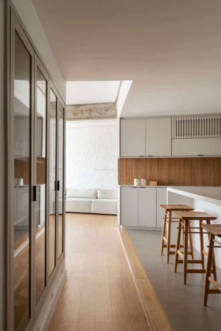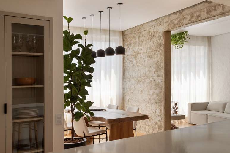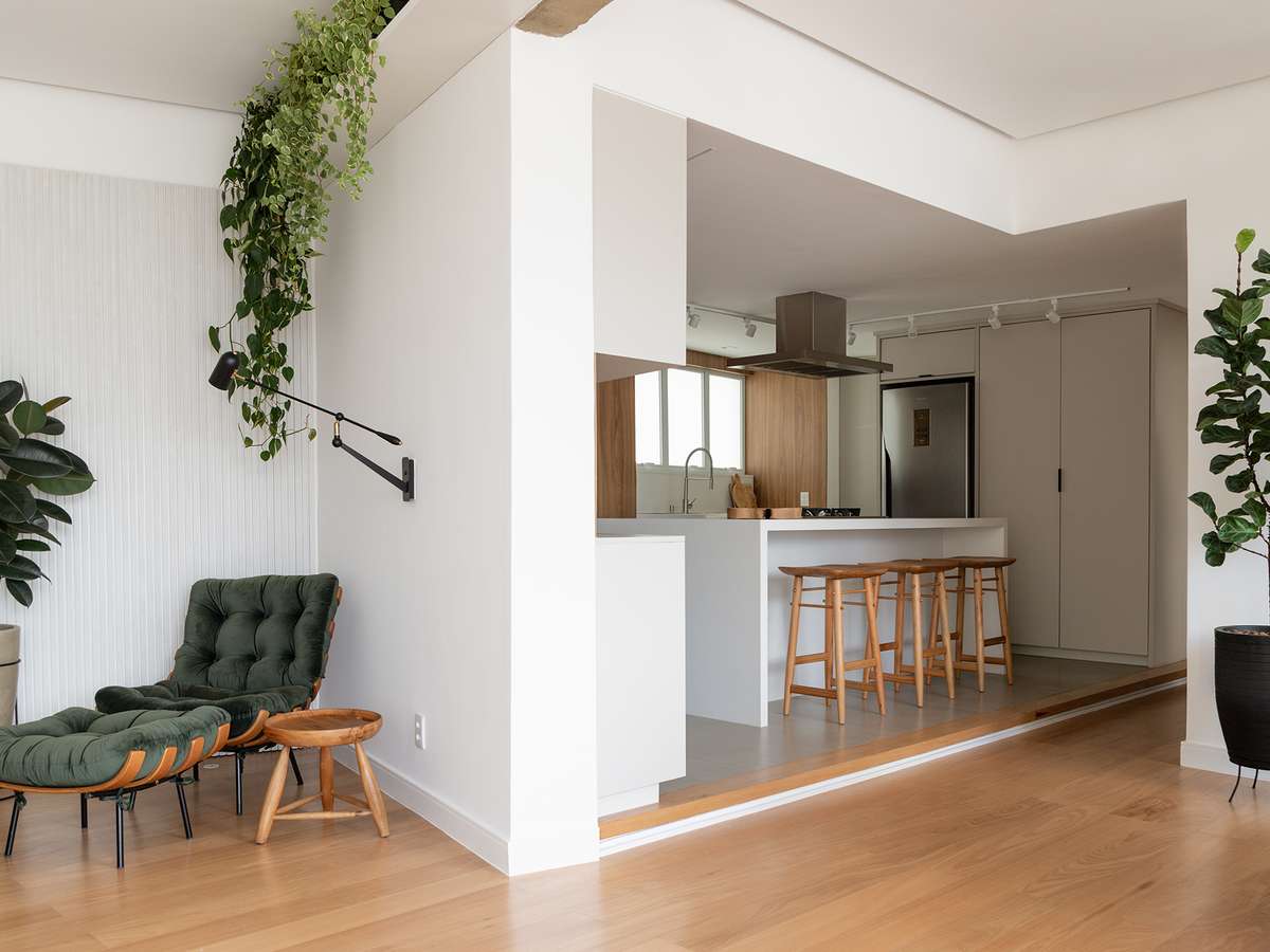 Vigas, reboco aparente e texturas artesanais marcam este apê de 130 m²