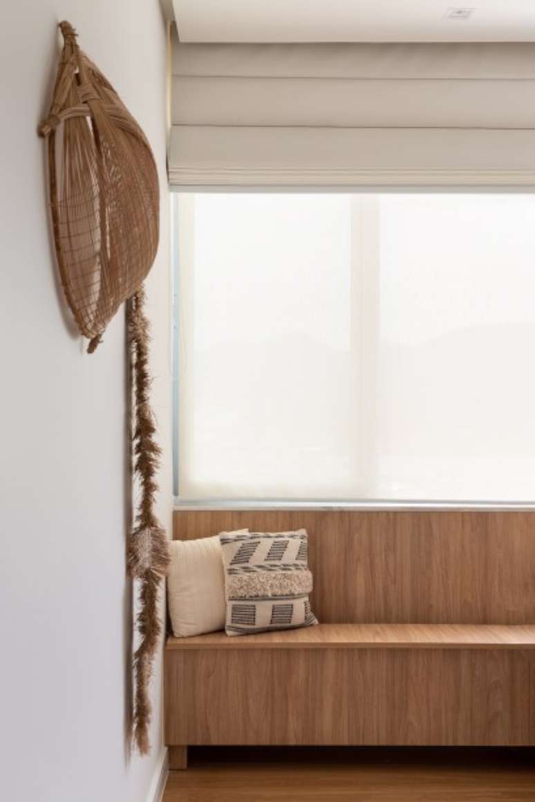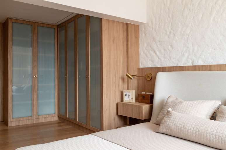 O quarto do casal foi ampliado para incluir um closet, enquanto ajustes na angulação da parede foram feitos para a instalação da sapateira, que ficou disfarçada na parede da TV, com brises na marcenaria para a ventilação dos sapatos.