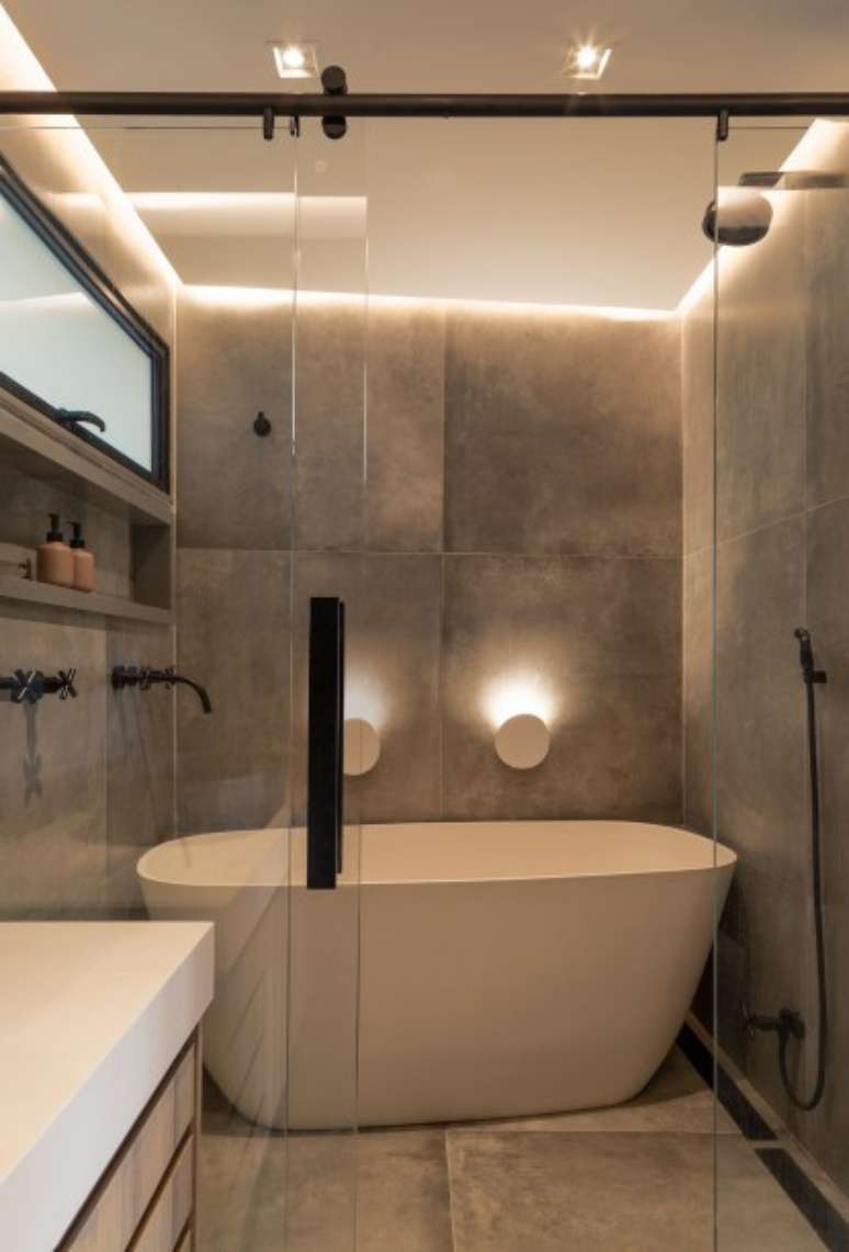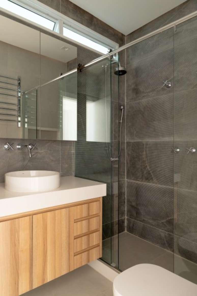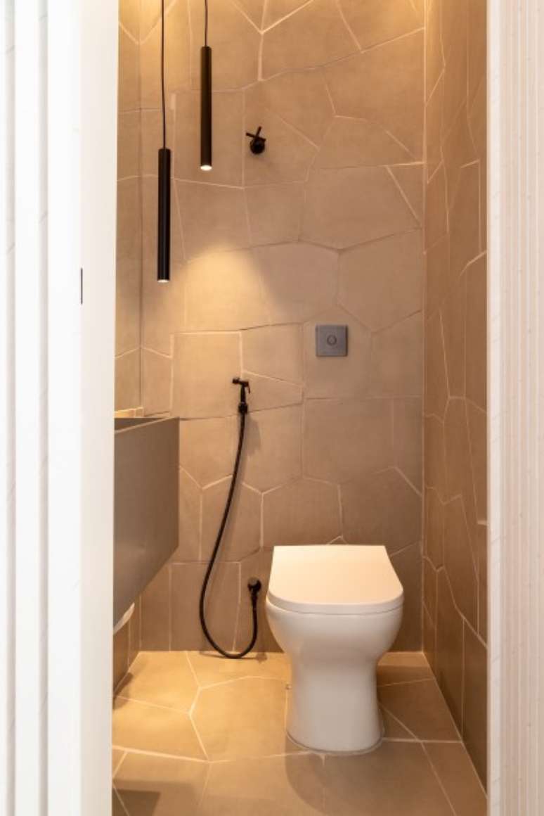 Morando a poucas quadras da praia, o morador tem paixão por futevôlei e, por isso, a reforma foi pensada desde a lavanderia. "Planejamos um ponto de água e esgoto que serve tanto para os moradores lavarem os pés ao voltar da praia, quanto para o banheiro inteligente da cadelinha. Há uma ducha higiênica com saída da água diretamente para o ralo, facilitando a manutenção e higiene", detalha Mariana.