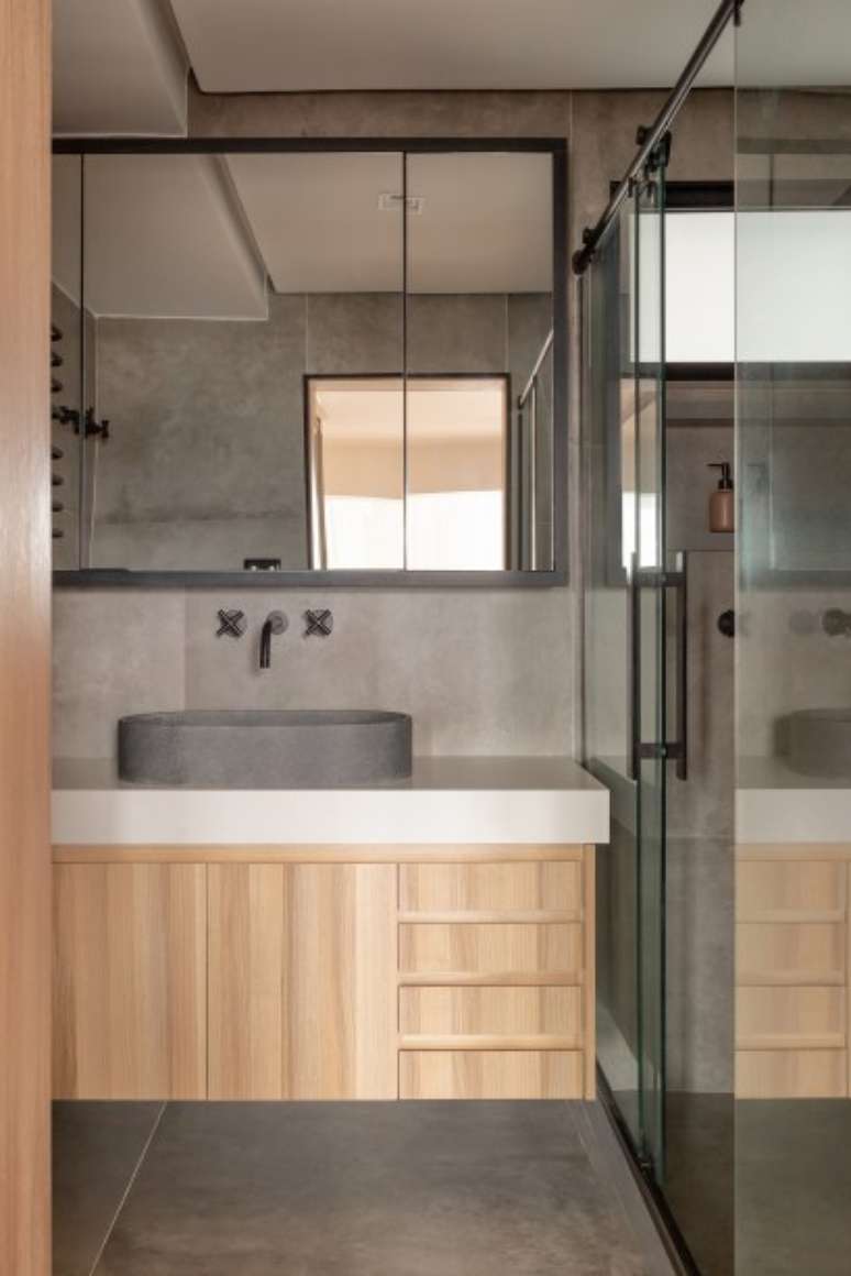 "Os clientes têm um excelente senso estético e afinidade de estilo e buscavam um projeto atemporal. Valorizamos as vigas e as paredes de concreto (tirando o reboco), além de utilizar diversas texturas e cores claras para manter o ambiente iluminado e clean", conta a profissional.