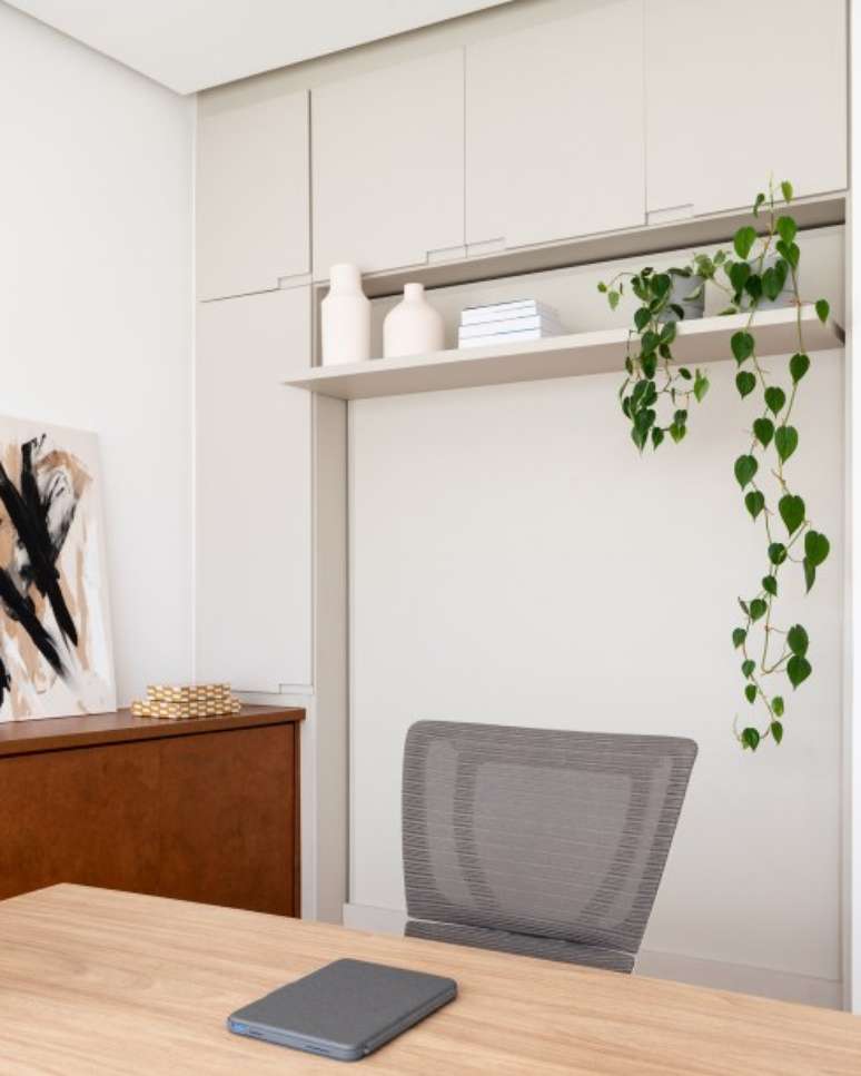 O escritório, ponto central para o trabalho dos moradores, precisava de uma cama para receber hóspedes. Então, foi feita uma marcenaria em que a cama fica embutida no armário.