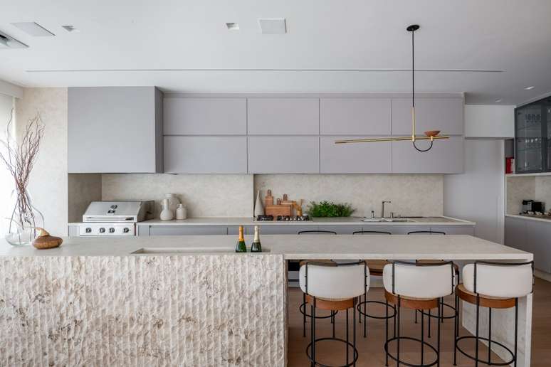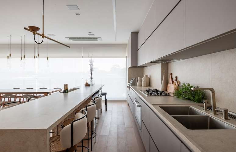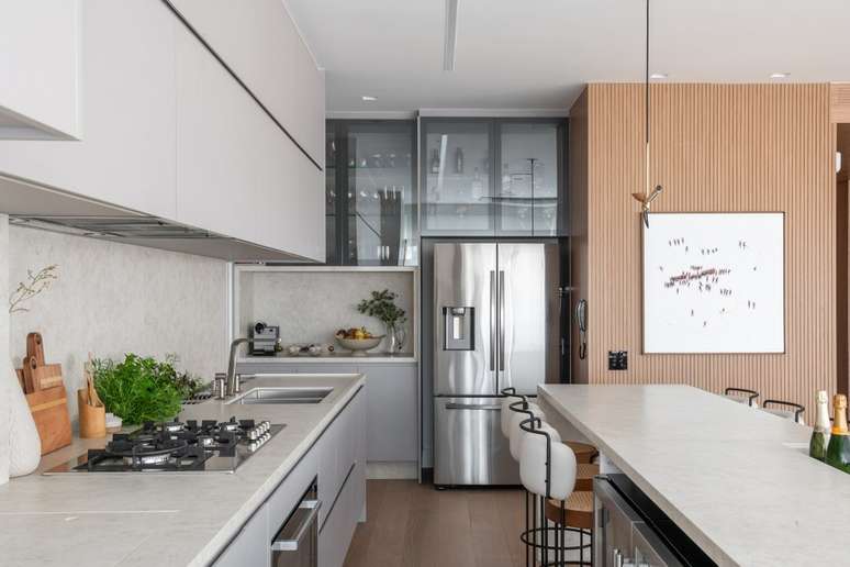 A cozinha foi integrada ao social de forma sutil, com linhas lineares na cor cinza claro e módulos grandes para servir de fundo ao espaço sem interferir esteticamente. A geladeira foi encaixada na lateral para ficar escondida - ao seu redor, uma cristaleira e uma área para as bebidas destiladas funciona como bar.
