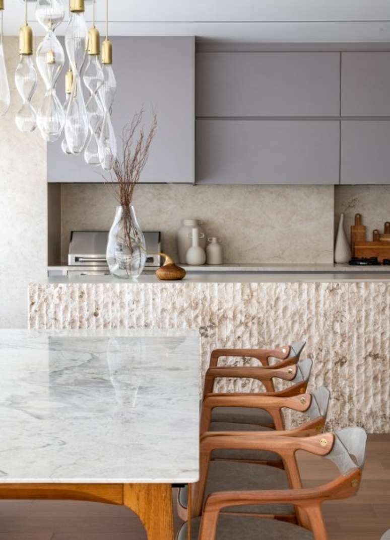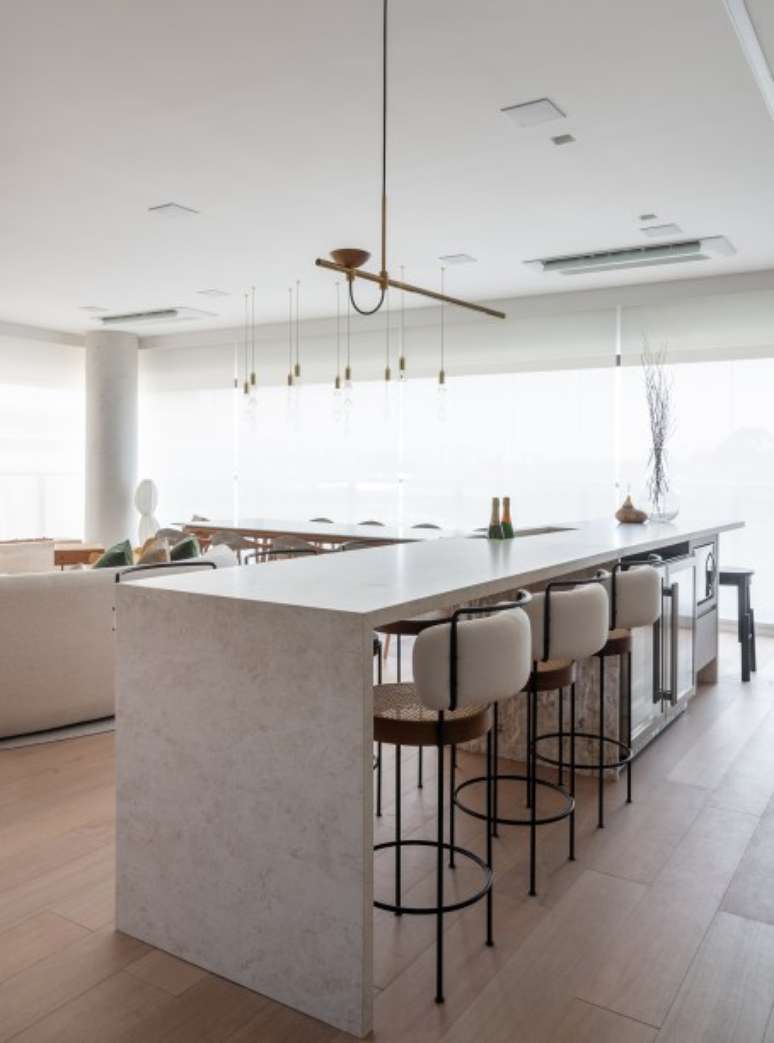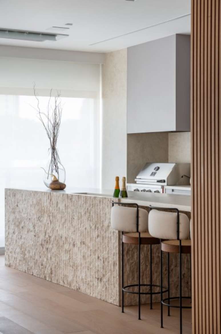 A ilha foi pensada para ter altura confortável e ficou apenas 2 cm acima da bancada da cozinha (para esconder a estrutura atrás). "Usamos a costaneira de travertino natural, criando o bloco onde fica a champanheira, e especificamos uma lâmina sinterizada para fazer o tampo e a lateral ao lado das banquetas", conta Ana Carolina. Um grande tapete une todos os ambientes.