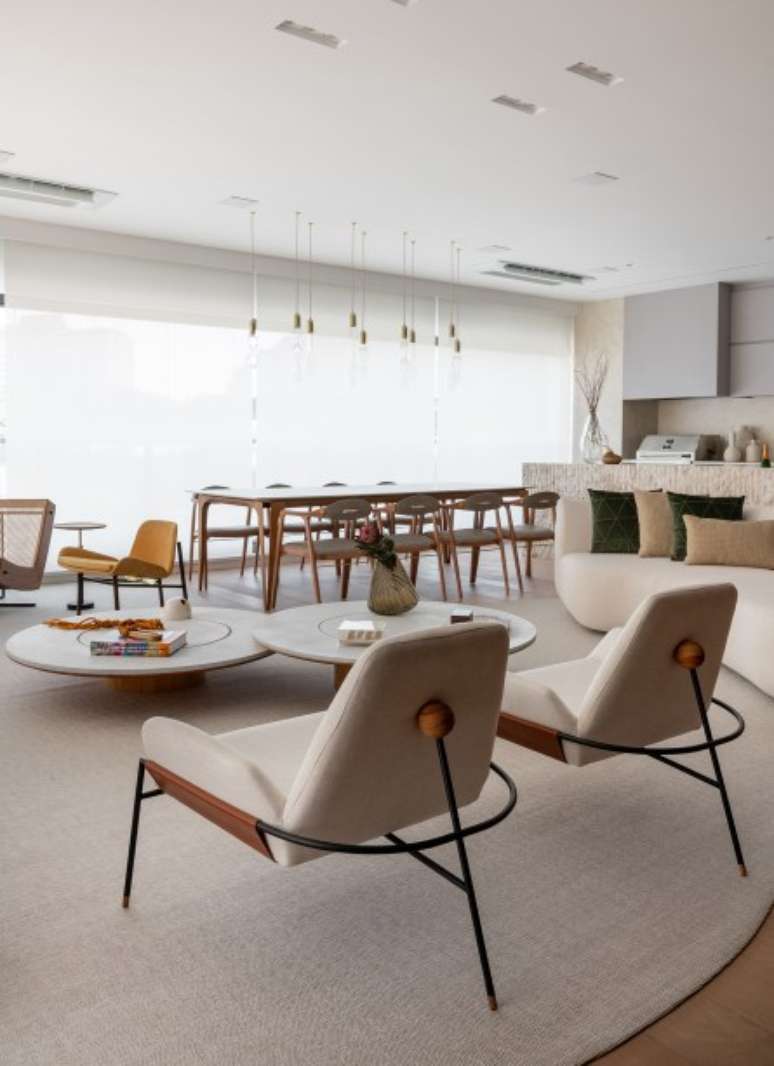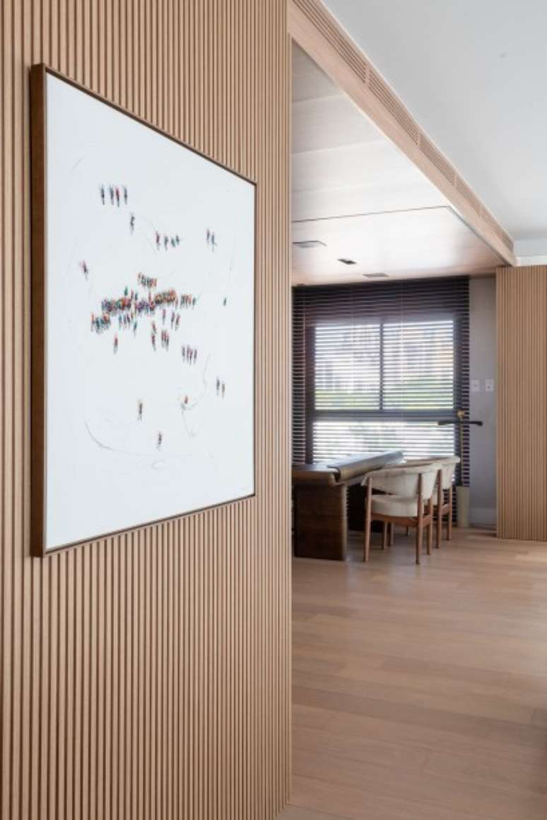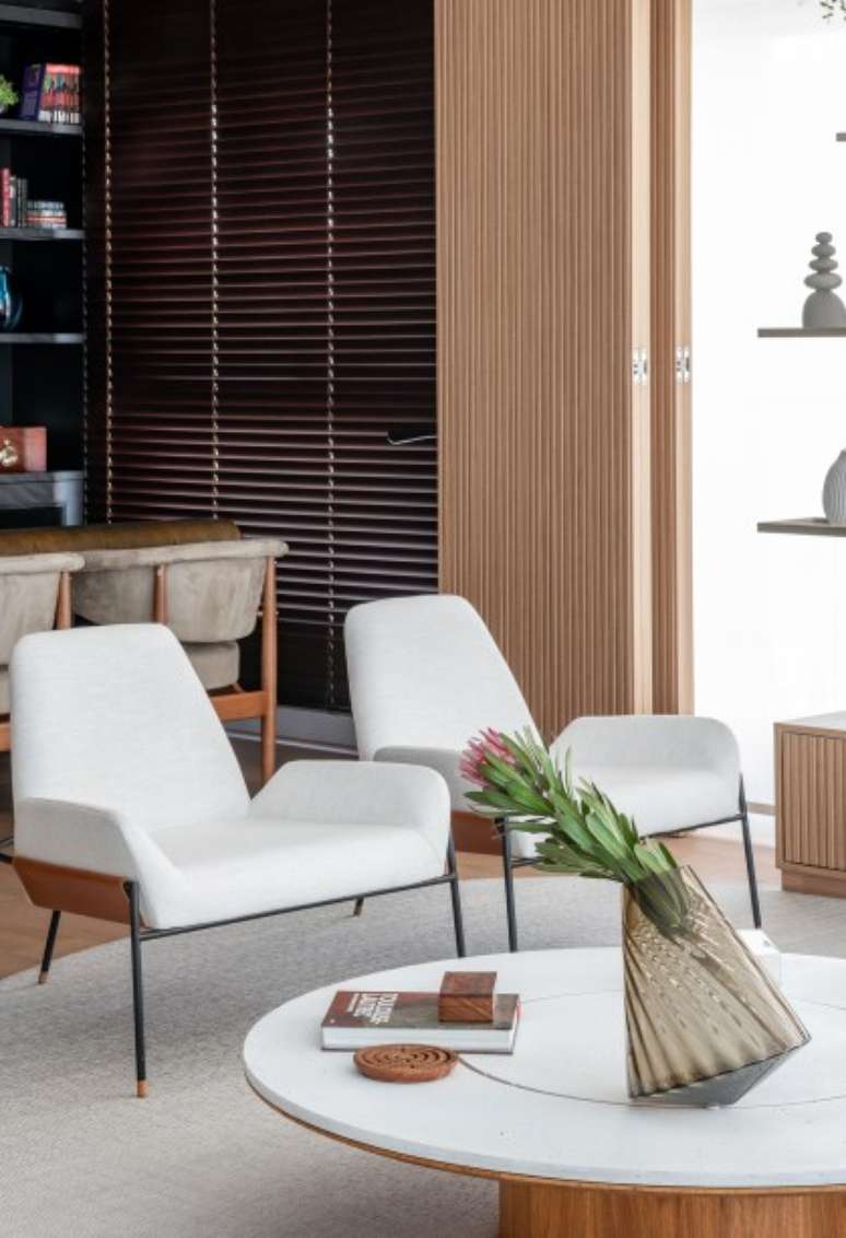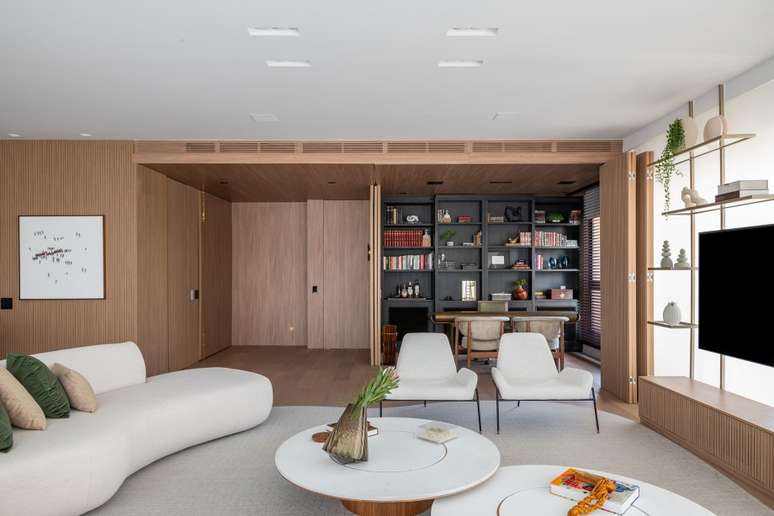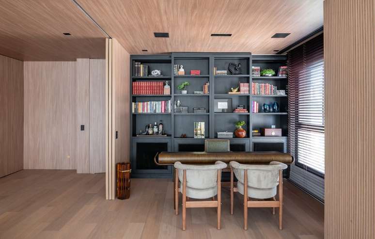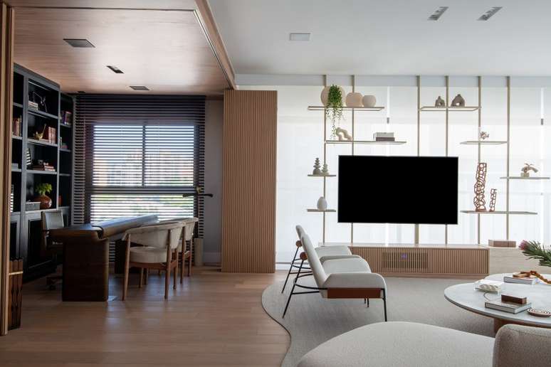 "A cliente desejava tons claros e materiais naturais que trouxessem aconchego. Já o cliente queria um home office clássico, sofisticado, estiloso com tons escuros e materiais nobres como madeira e couro, além de uma pegada vintage", conta a arquiteta. Para esse problema, um sistema de abertura e fechamento pleno do home office viabilizou totalmente a integração do espaço, preservando a privacidade do ambiente quando necessário.