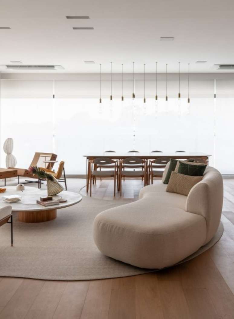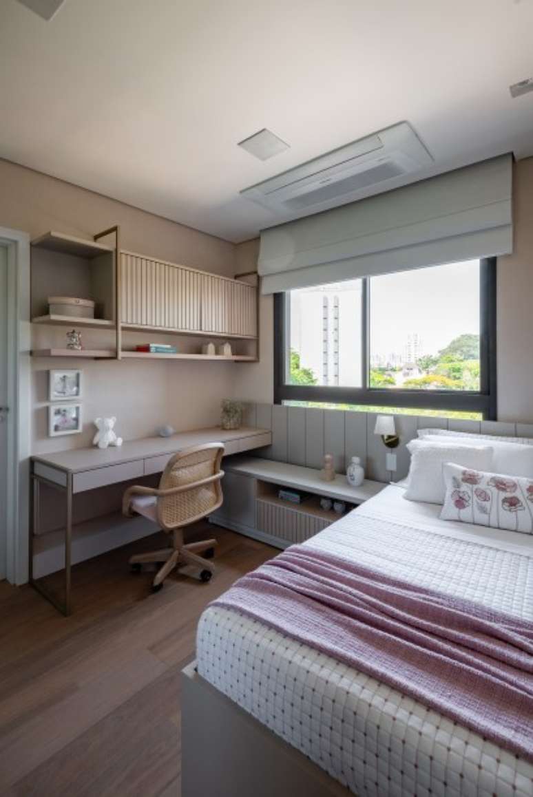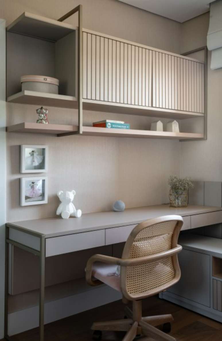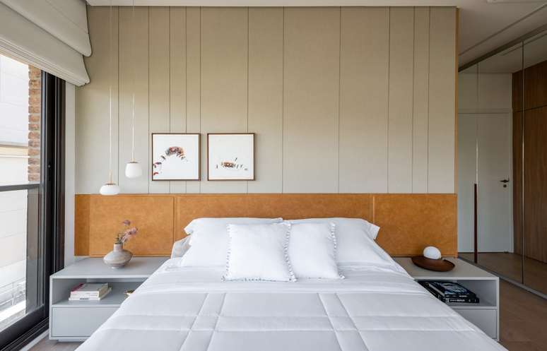 "A cliente desejava tons claros e materiais naturais que trouxessem aconchego. Já o cliente queria um home office clássico, sofisticado, estiloso com tons escuros e materiais nobres como madeira e couro, além de uma pegada vintage", conta a arquiteta. Para esse problema, um sistema de abertura e fechamento pleno do home office viabilizou totalmente a integração do espaço, preservando a privacidade do ambiente quando necessário.