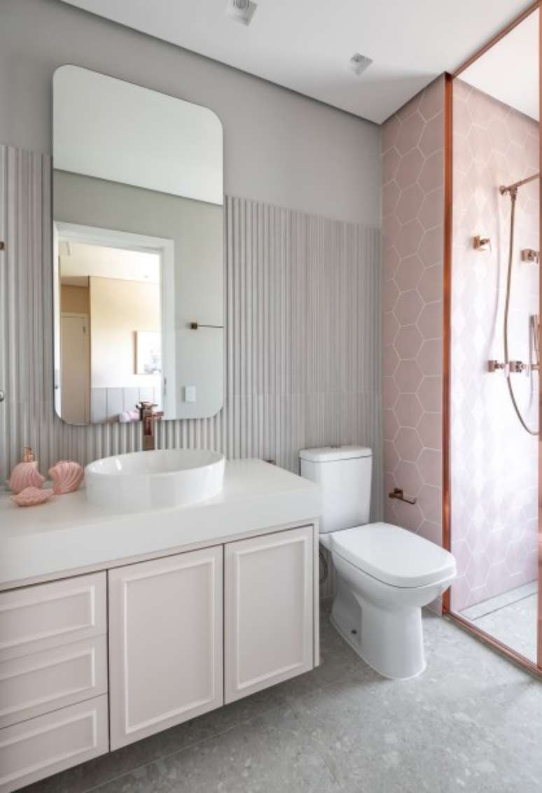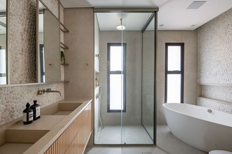Para a suíte, a proposta foi criar um banheiro spa, com banheira de imersão, além de uma sauna no chuveiro. "Trabalhamos o espaço com uma banheira de imersão e seixo rolado com porcelanato no piso, parede e bancada", enumera a arquiteta.