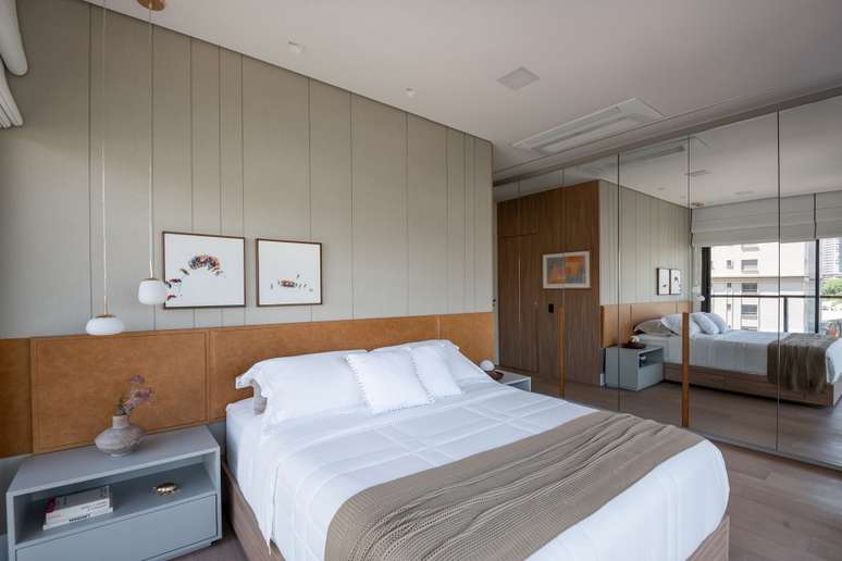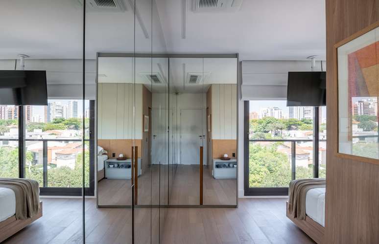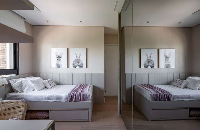 Como o quarto não tem closet, a proposta foi usar os armários com portas espelhadas na intenção de fazer desaparecer o grande armário e dar mais amplitude ao ambiente. As camas ganharam gavetões para sapatos.