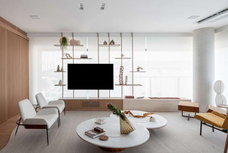 Para dar mais cara de quadro, o escritório especificou o modelo The Frame, da Samsung, e desenhou um grande rack que foi unificado à lareira. As linhas horizontais permitem que a luz inunde o espaço. Cortinas de vidro que podem ser completamente abertas em dias de calor potencializam a ventilação cruzada e a iluminação natural.