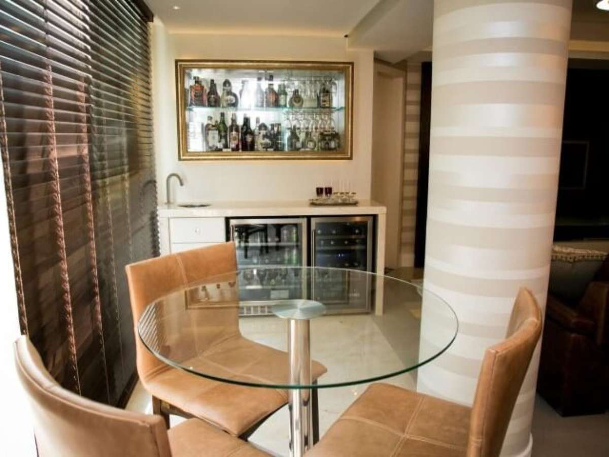 28. Mesa redonda de vidro preto com cadeiras cromadas. Projeto de Gislene Lopes