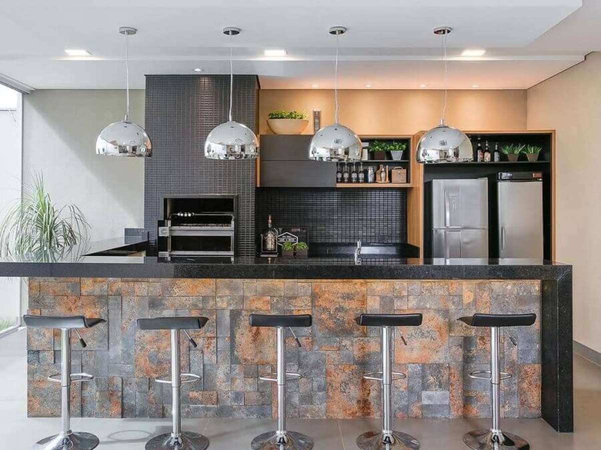 37. Banquetas modernas para área gourmet decorada com pendentes pretos – Foto: Pinterest