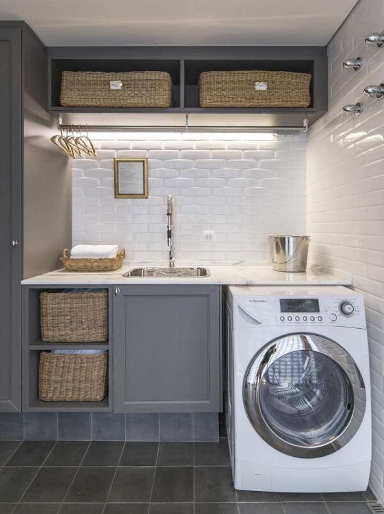 40. Os cestos ajudam na organização e os adesivos nas máquinas de lavar ajudam na decoração da área de serviço simples. Fonte: Pinterest