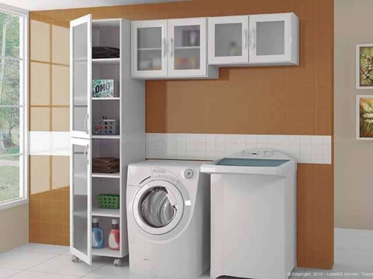 Apesar de normalmente não ser muito grande, a lavanderia também precisa de locais para armazenamento. Nela, alguns produtos de limpeza são sempre usados e é bom tê-los à mão, como sabão em pó, amaciante, alvejante e afins. Para eles, pode ser interessante usar um armário multiuso aéreo logo acima da máquina de lavar.