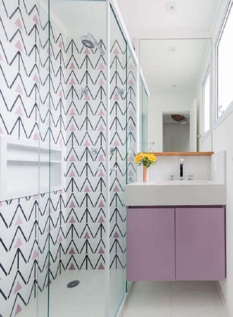 1. Decoração para banheiro feminino branco e lilás pequeno – Foto: Casa e Jardim