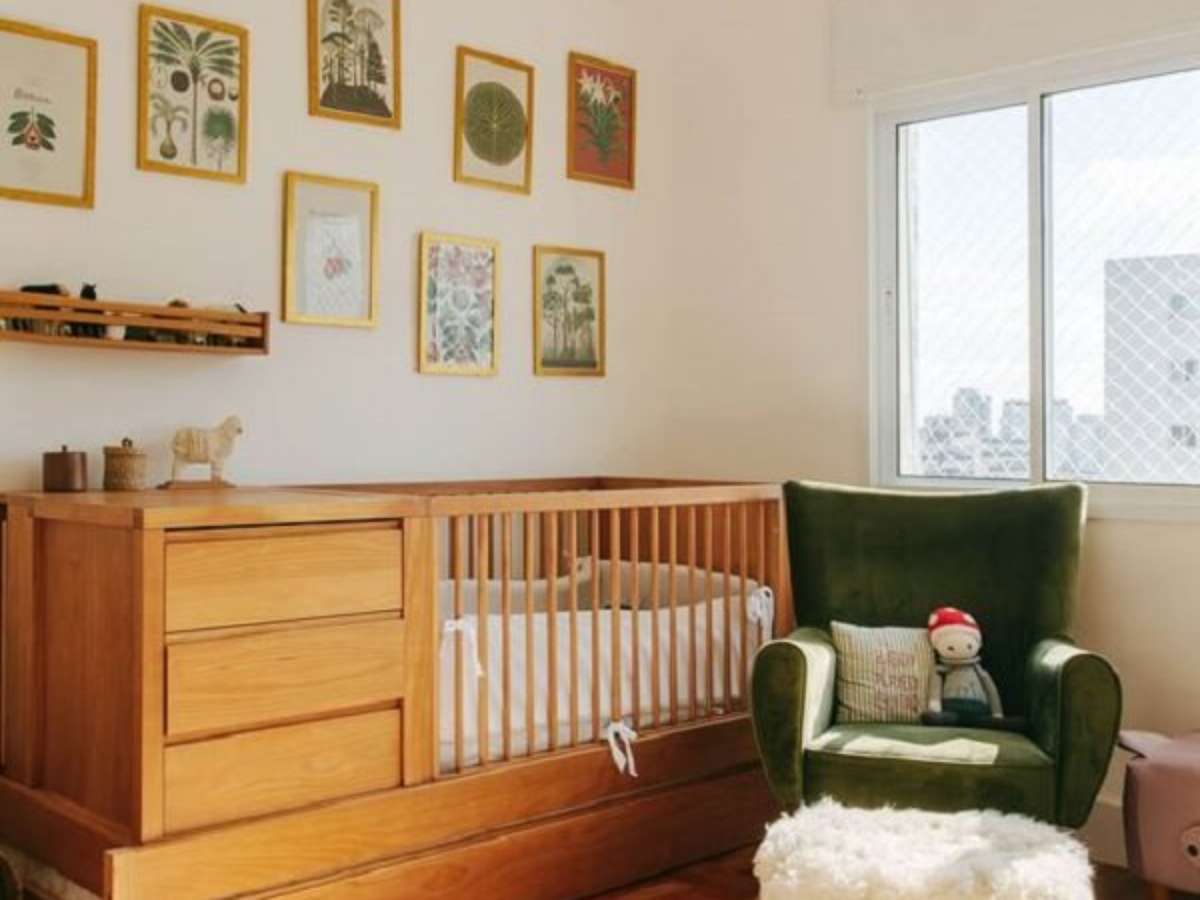 1. Berço com gaveta de madeira se contrasta com a poltrona verde. Fonte: Histórias de Casa